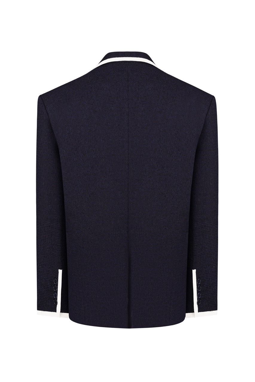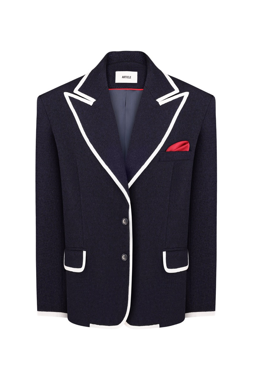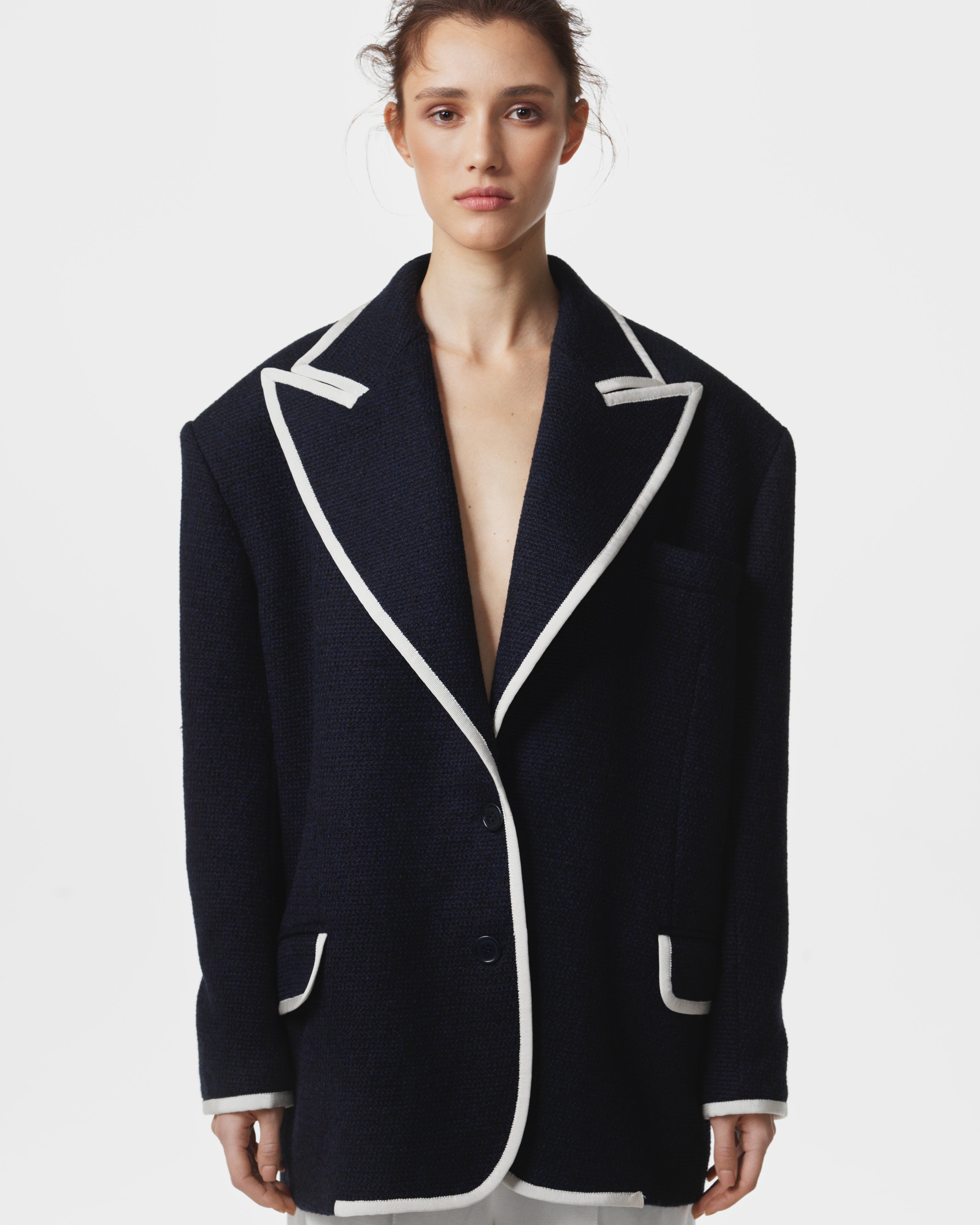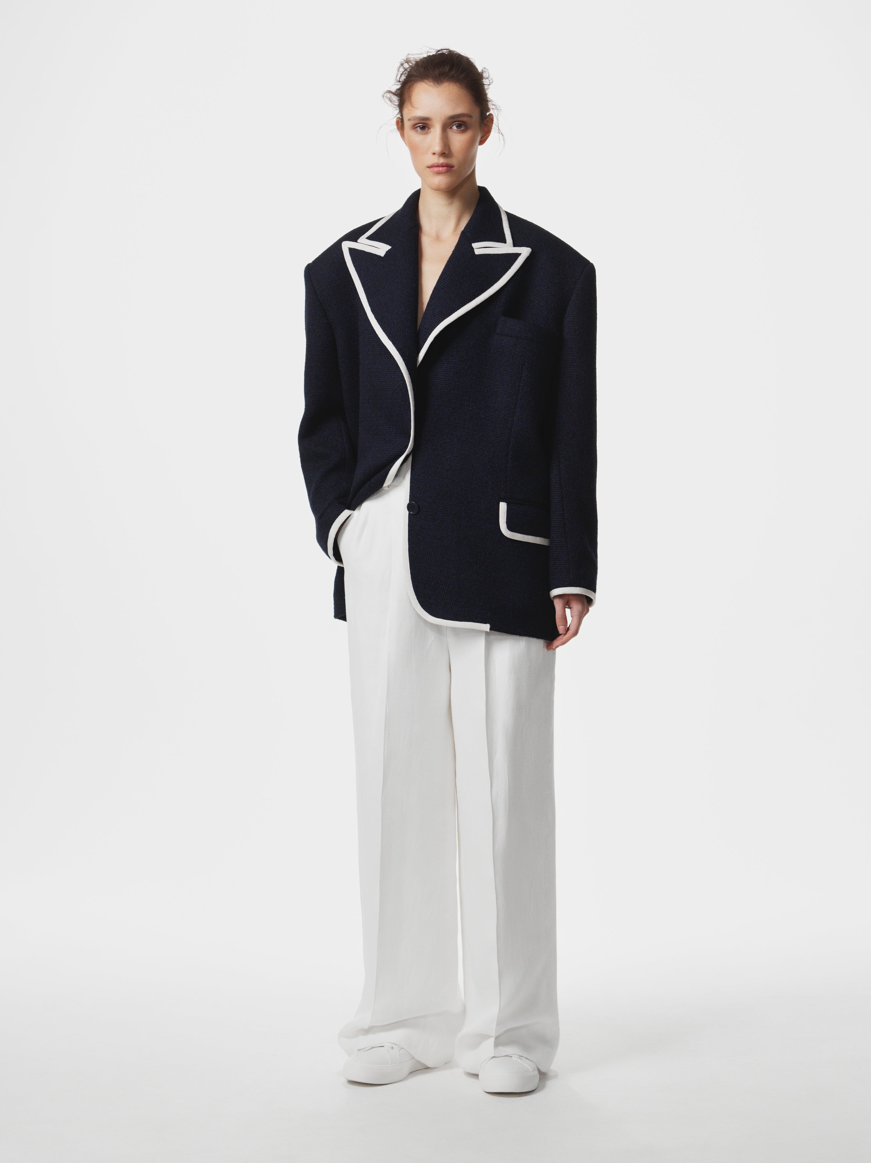 The single-breasted oversized blazer is made of natural soft wool. The model has a loose fit with a dropped shoulder line and a soft silhouette. The design features decorative rep ribbon trim.