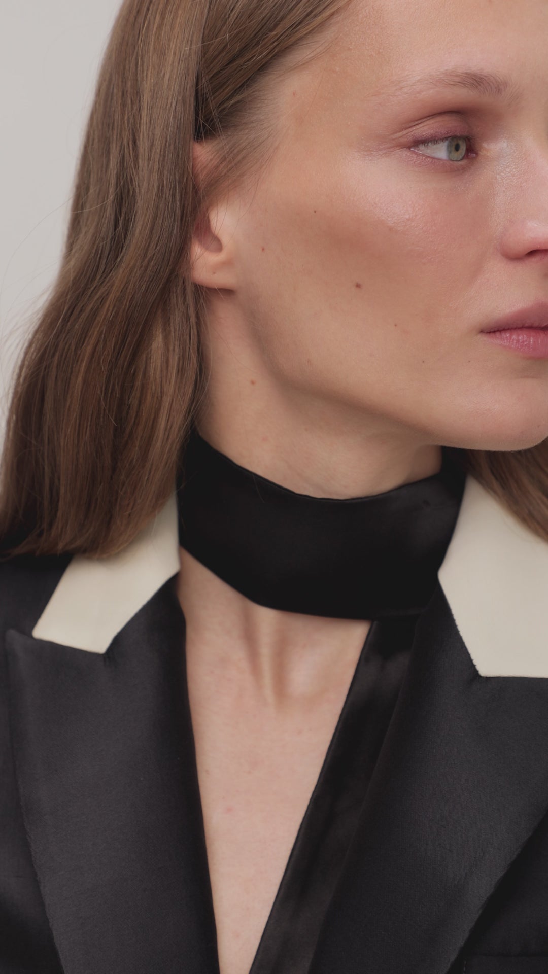 The silhouette of this silk blazer with retro allure is reinterpreted with unexpected details and a contemporary touch. The sophisticated design with straight lines, illuminated by an elegant silk collar in a contrasting color.