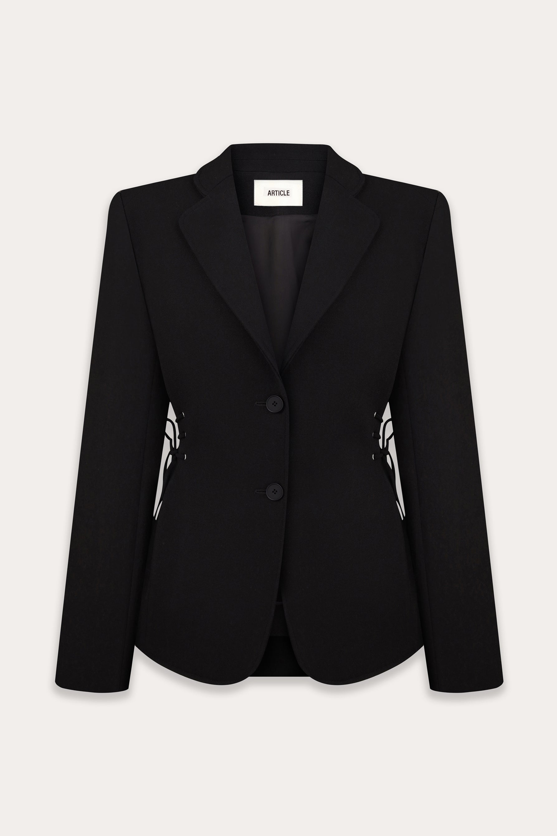 Opera blazer has a hourglass -inspired silhouette reinterpreted with refined, contemporary details. This single-breasted garment characterized by the classic fit and classic lapels and decorated with the waist belt construction.