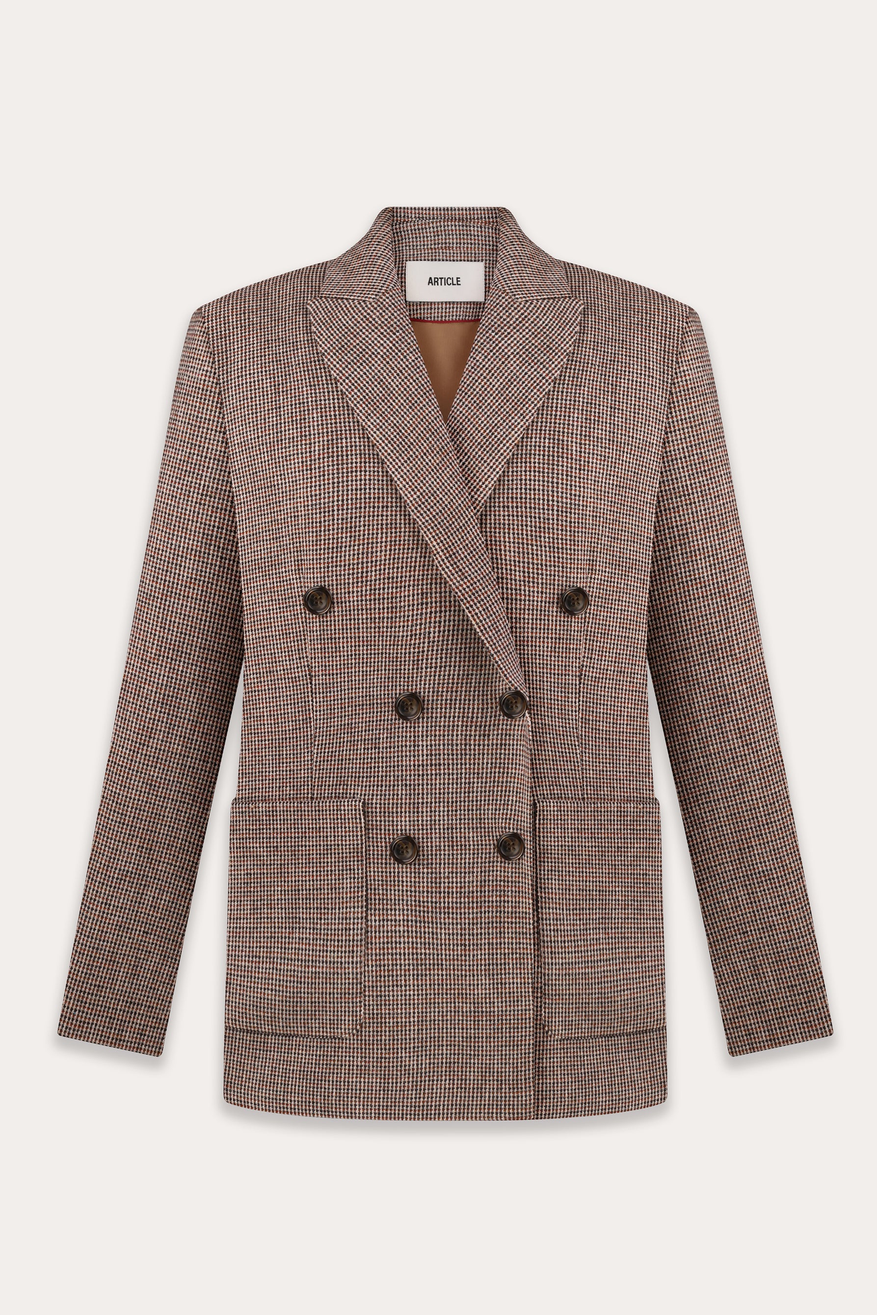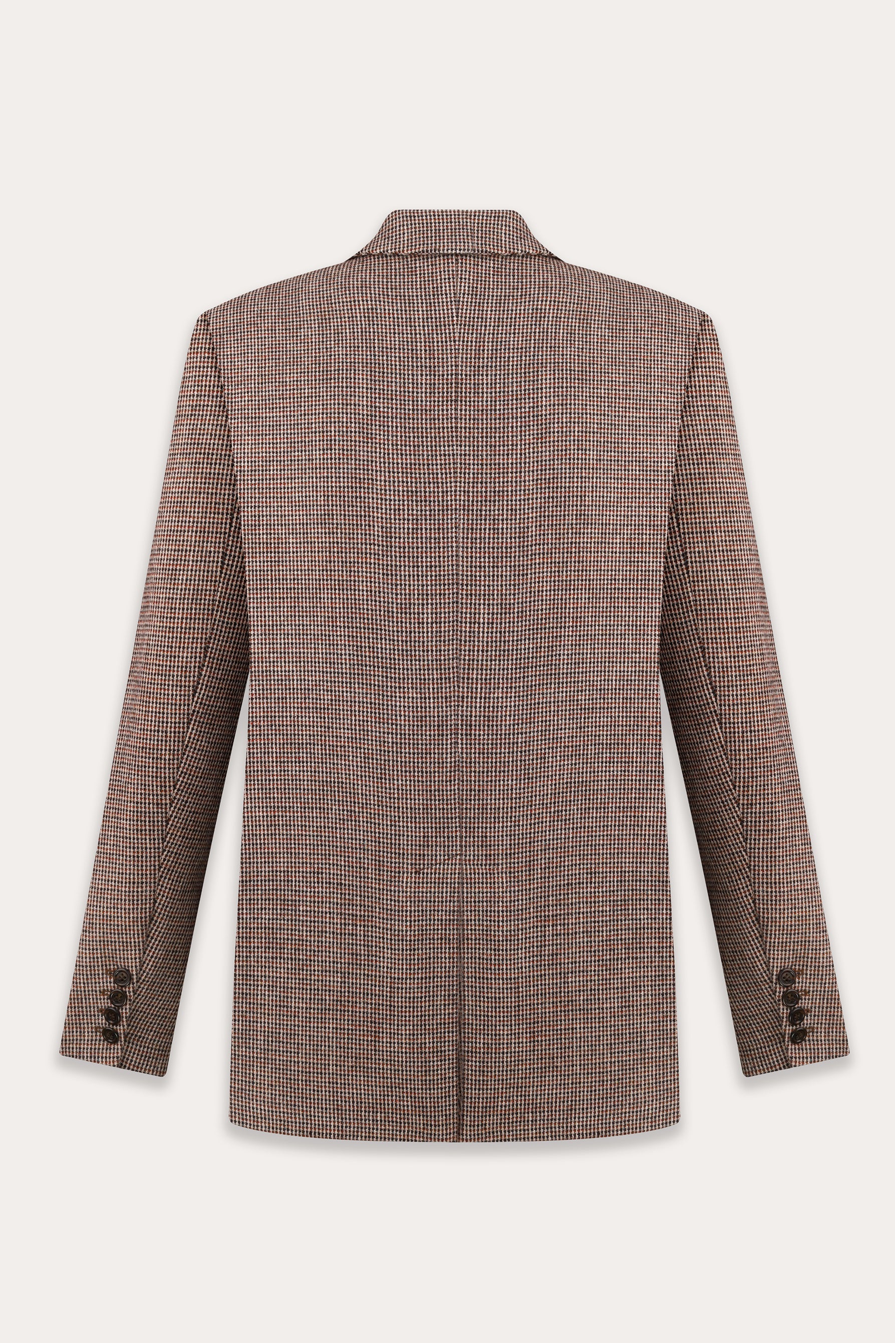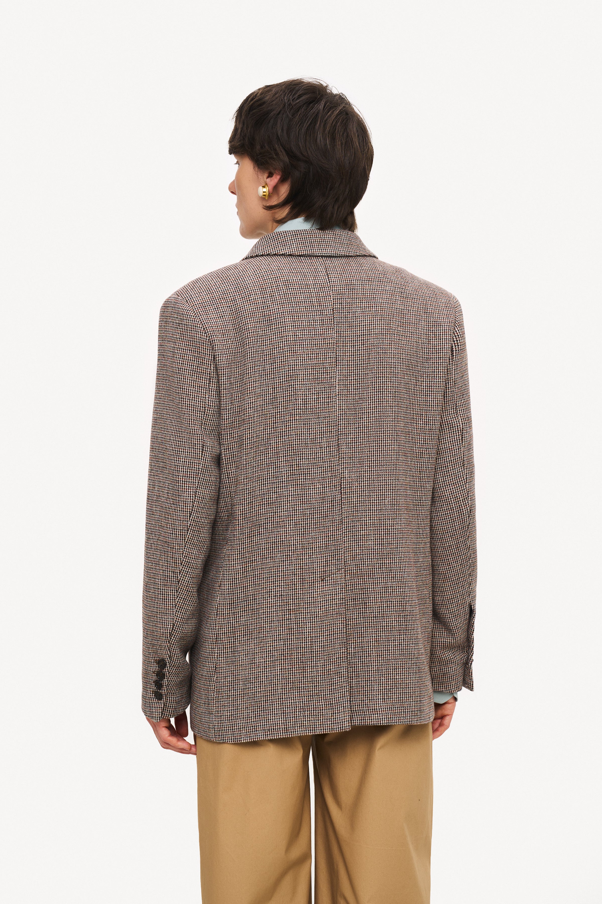 This vintage inspired woolen blazer has a classic menswear-inspired double-breasted silhouette. The turned-up sleeves reveal the lining, suggesting a sophisticated, casual gesture.
