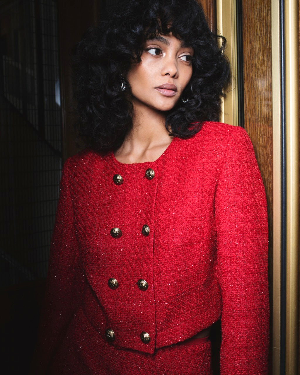 Cropped double-breasted blazer with sophisticated touch. Structured cut. The boxy silhouette with strong lines, characterized by the elegant round neckline, is embellished with sparkling golden buttons.