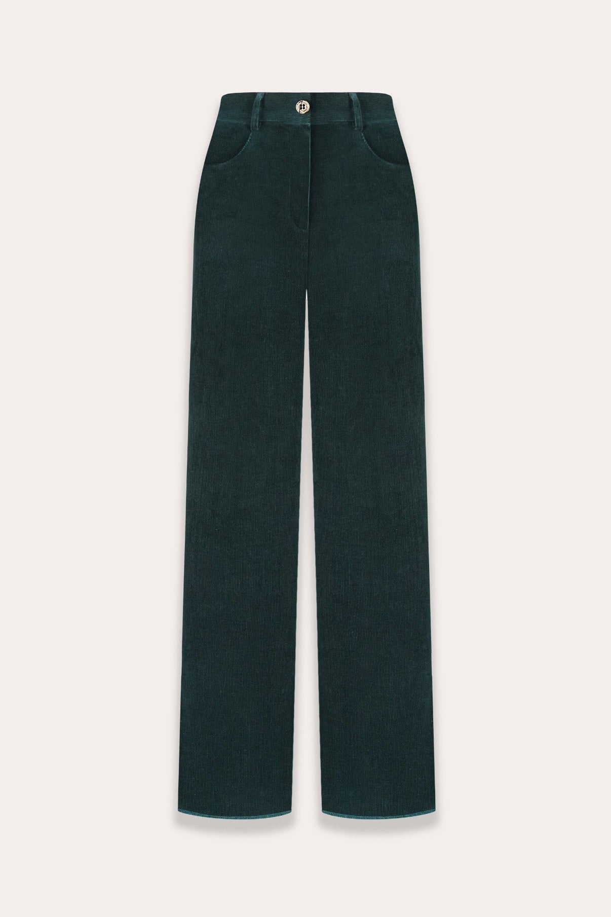 Straight-leg corduroy trousers in a deep emerald colour. The model has a high waist, belt loops, a zip fastening and a gold button. Rounded front and patch back pockets add structure to the model and create a concise, balanced silhouette.