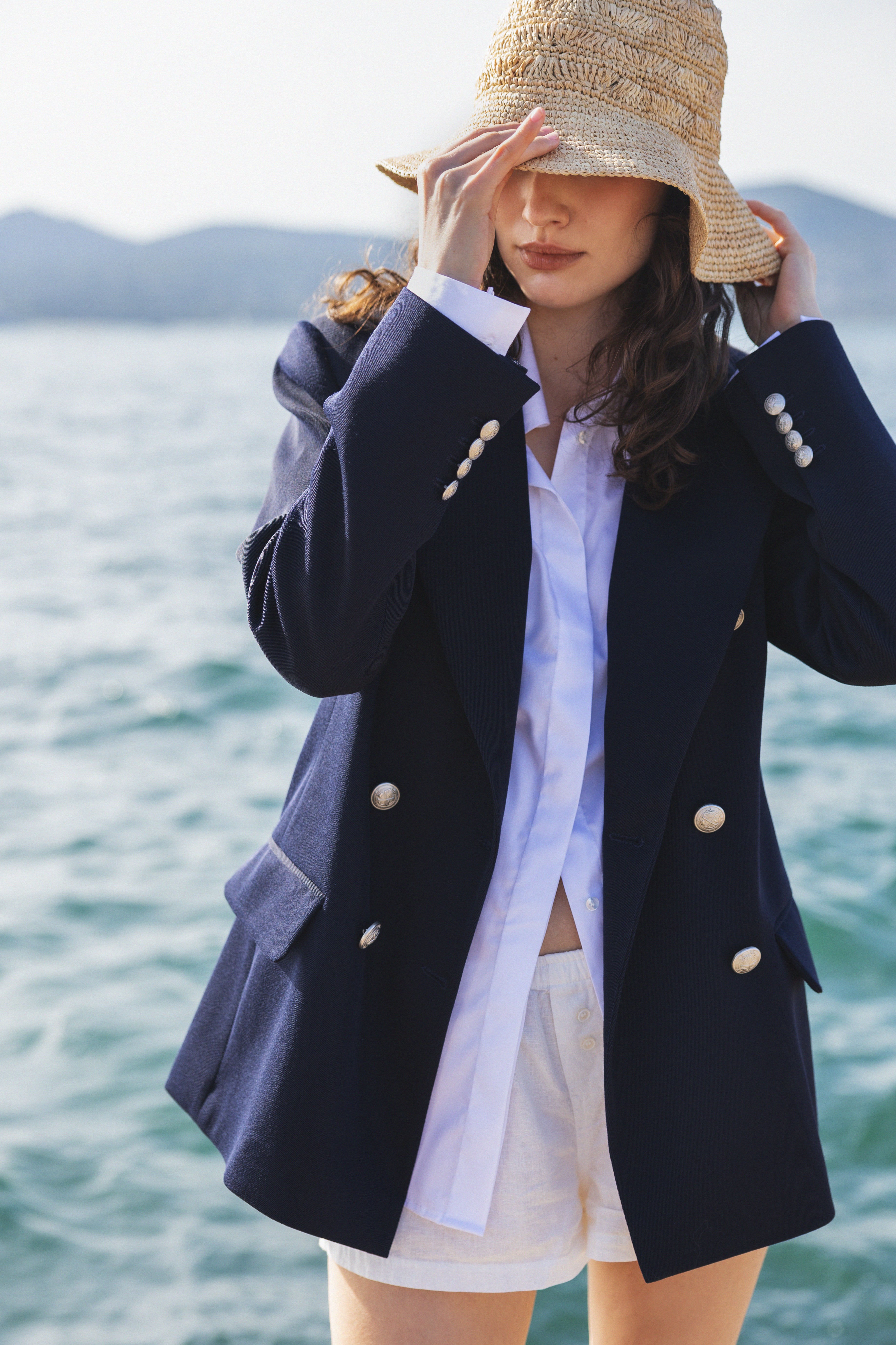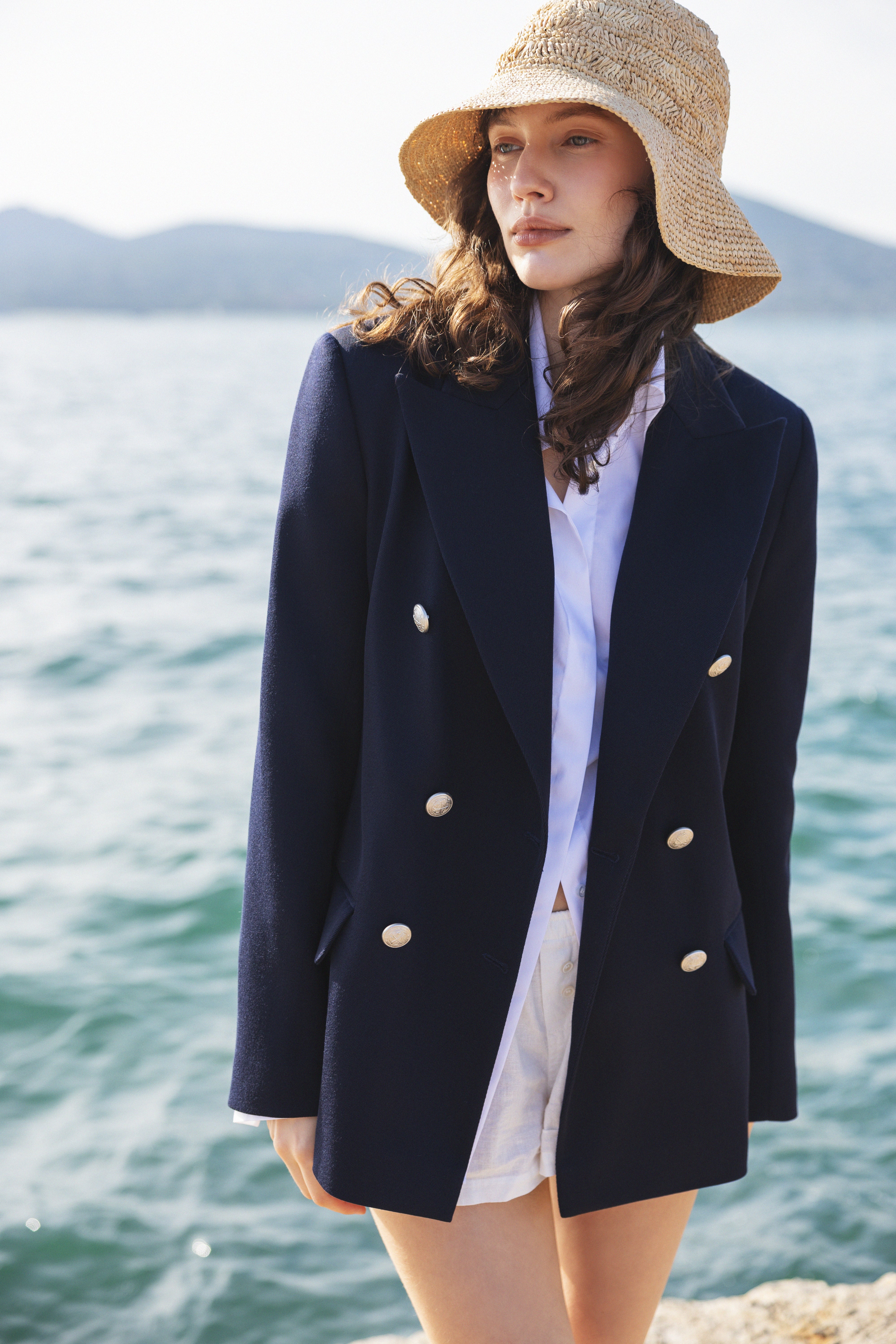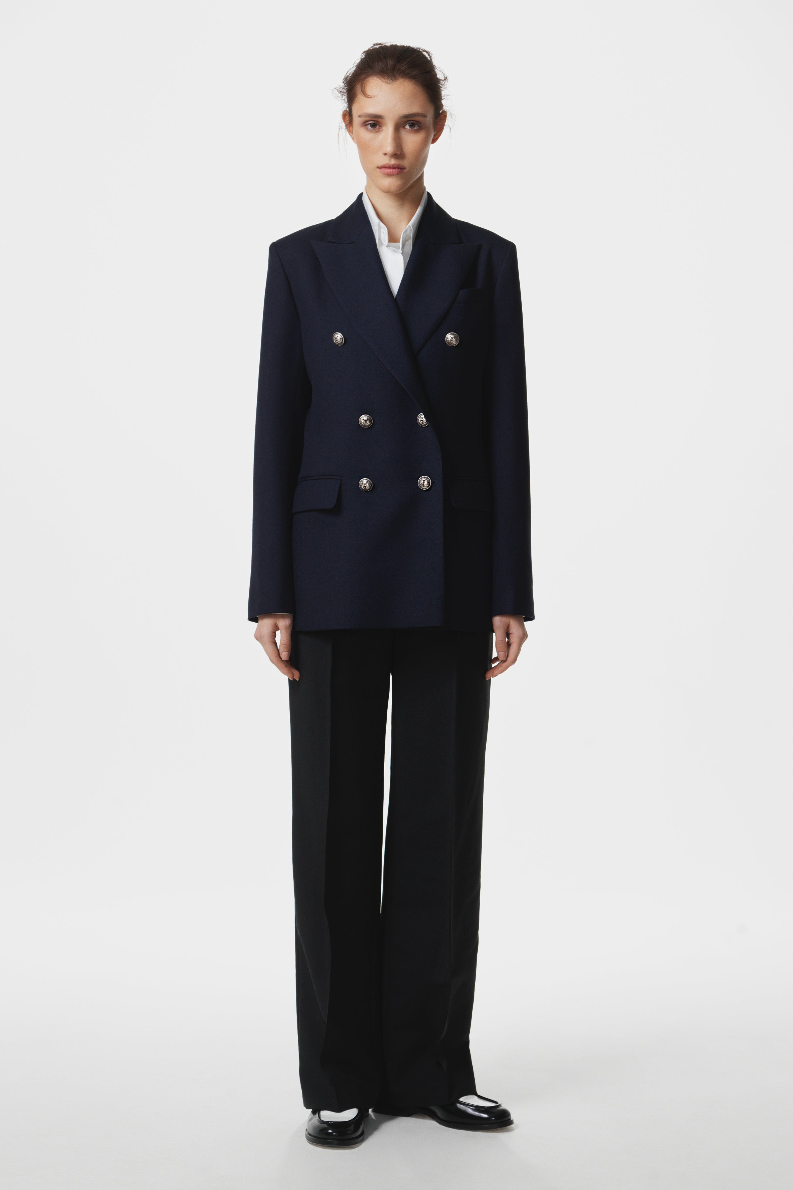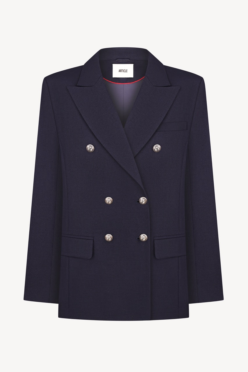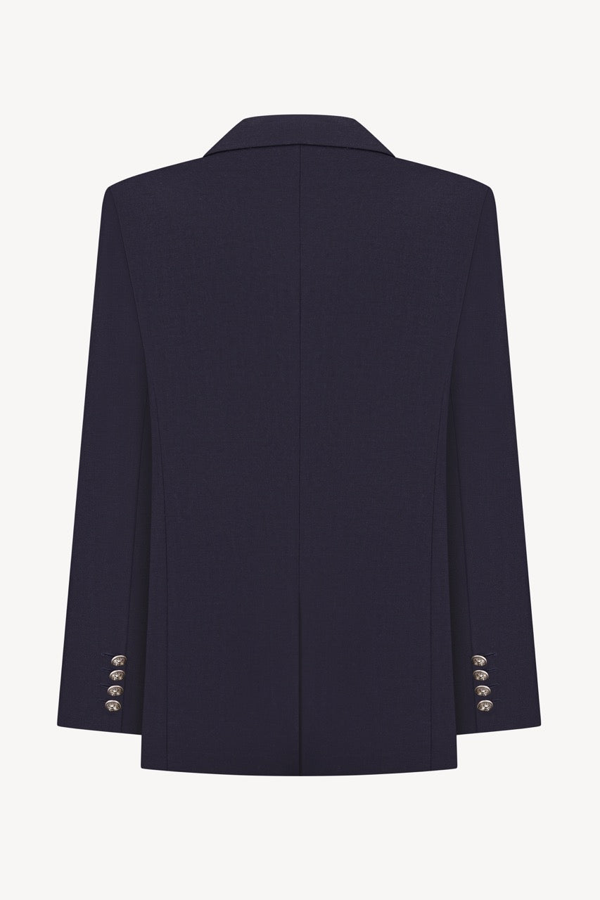 Double-breasted fitted tailored blazer with contrast buttons. Made of wool with slightly fitted waist and power shoulders.