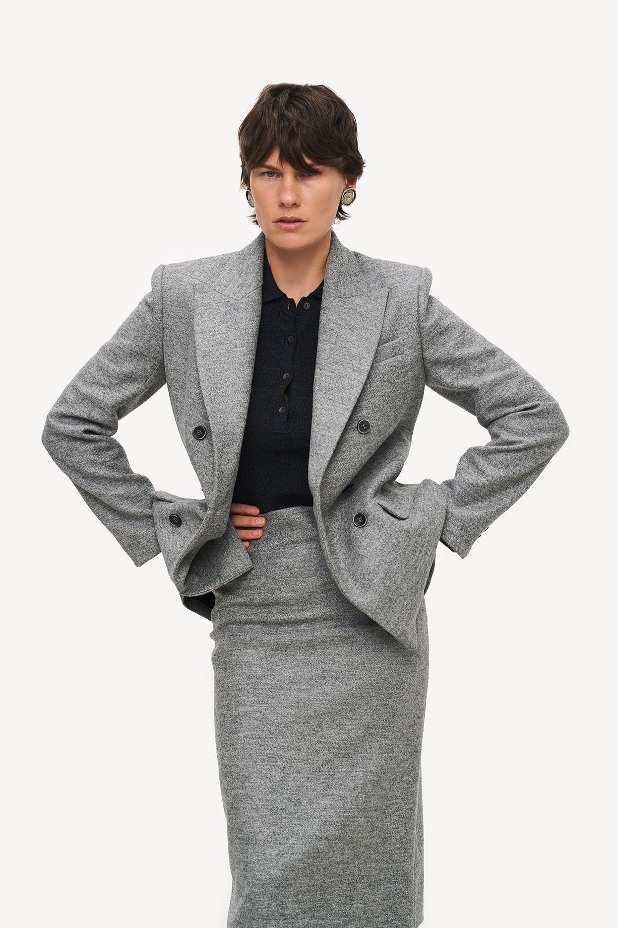 A fitted pencil skirt with a high waist and medium length. Made of natural wool, with a thin vertical stripe that emphasizes the silhouette lines. There are darts on the back for a precise fit, a concealed zipper and slits for ease of movement.