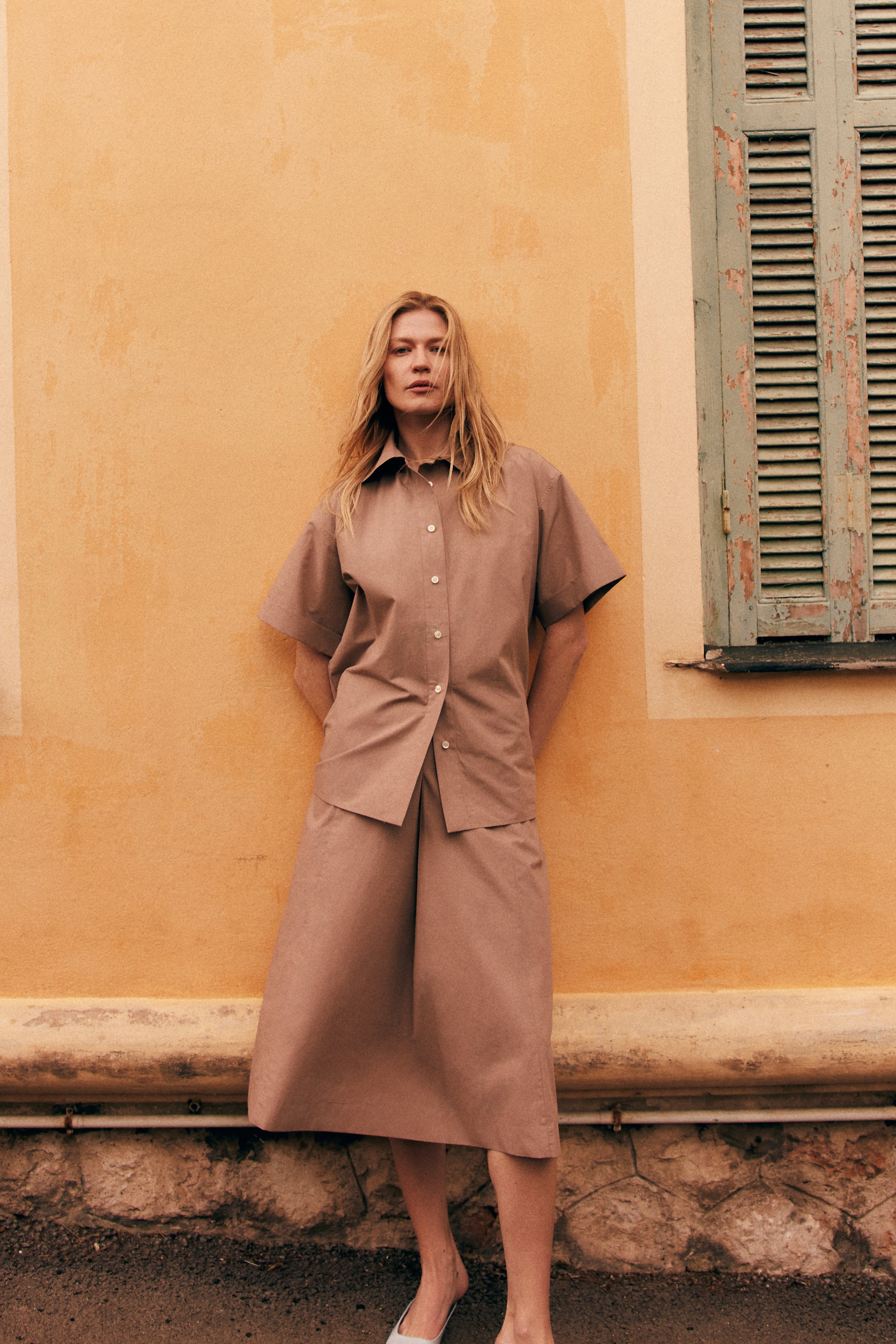Regular fit mid-length pleated skirt in chino cotton, features a flared silhouette. The skirt can be styled with the matching shirt to complete a sophisticated look