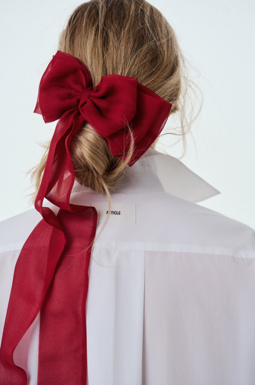 This bow is a statement of elegance. Made of 100% silk, it features an oversized silhouette with layered ribbons. Designed to elevate any look. Each bow comes with a matching silk fiber bag.