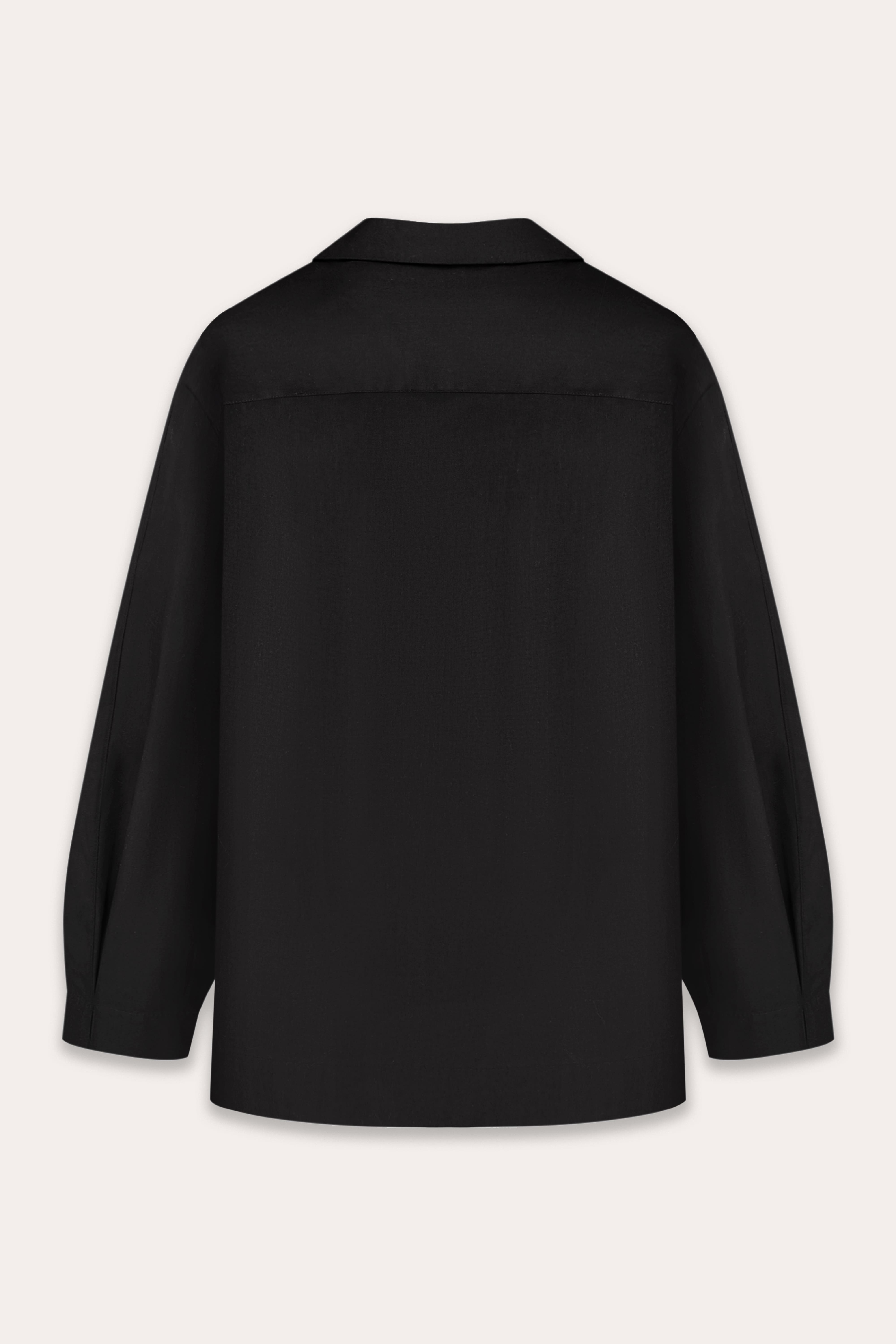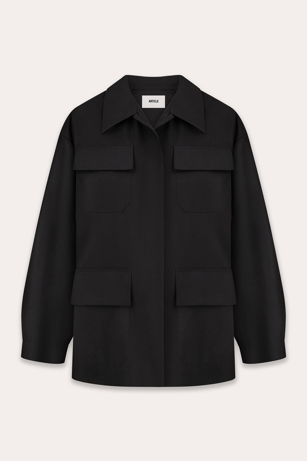 Outdoor jacket for everyday city edits, oversized shape, front patch pockets, and concealed front placket with snap closure.