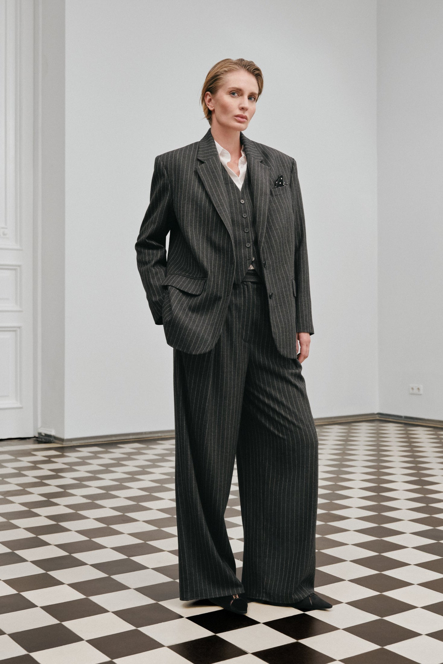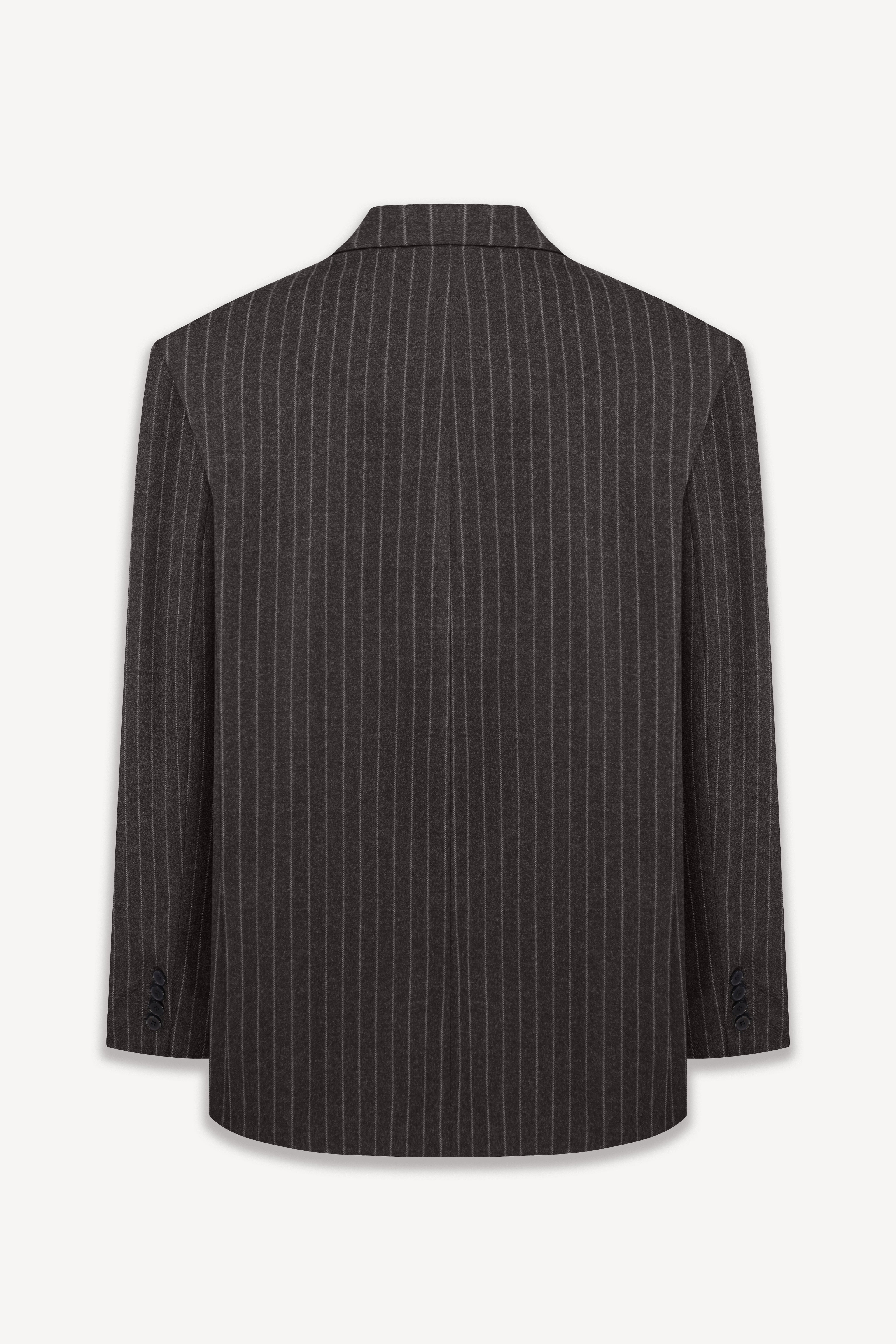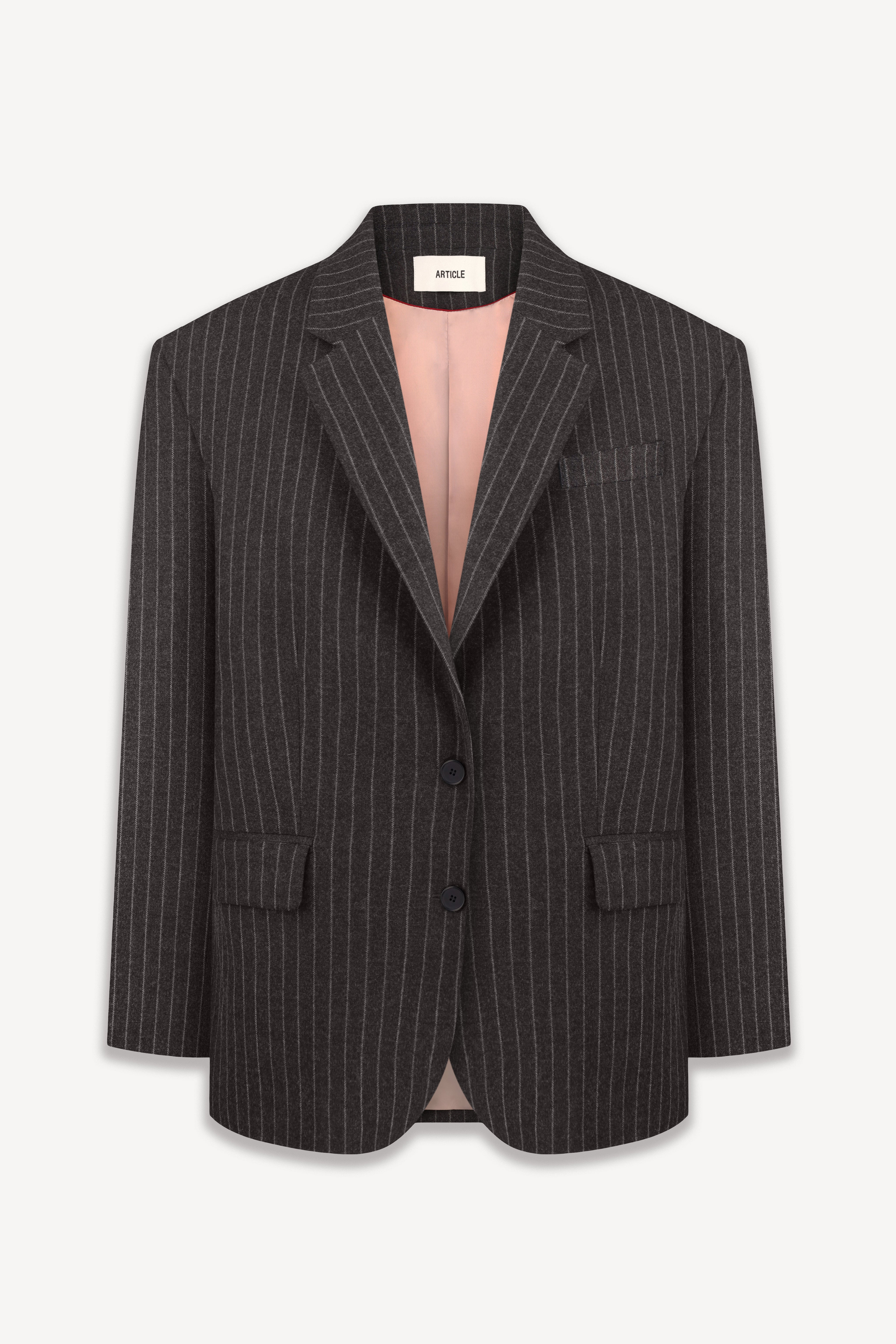 Однобортний блейзер Carré у стилі оверсайз виконаний з мʼякої італійської вовни. Модель має прямий силует із виразною лінією плеча та загостреними лацканами. Передня частина застібається на ґудзики та  доповнена кишенями з клапанами, а спинка й рукави — прорізними шліцами.