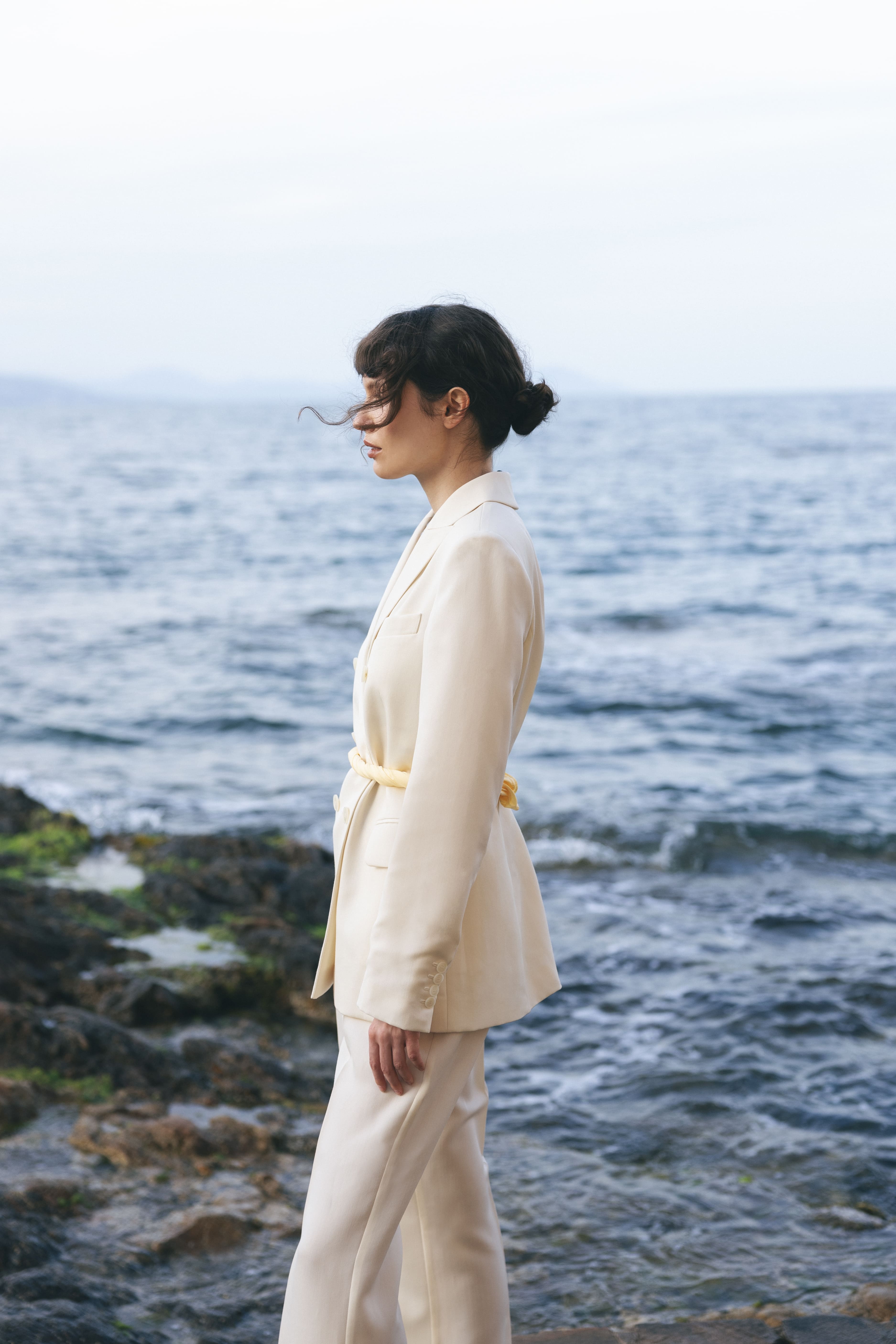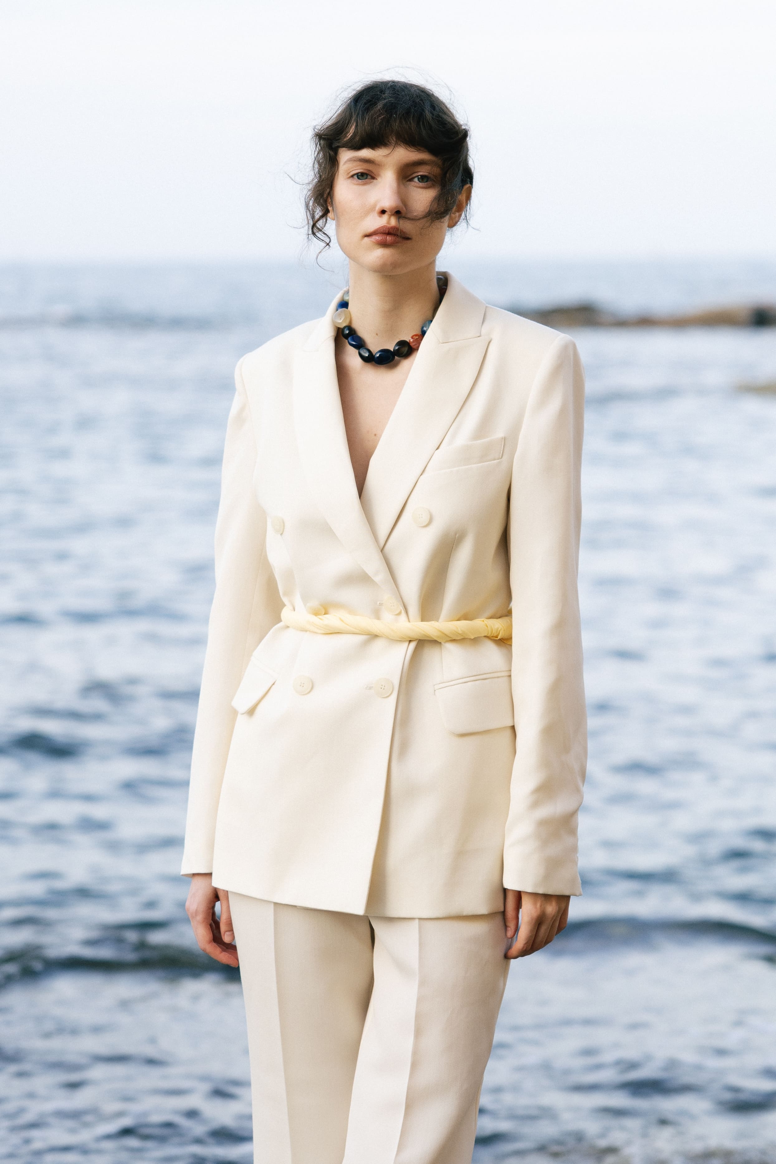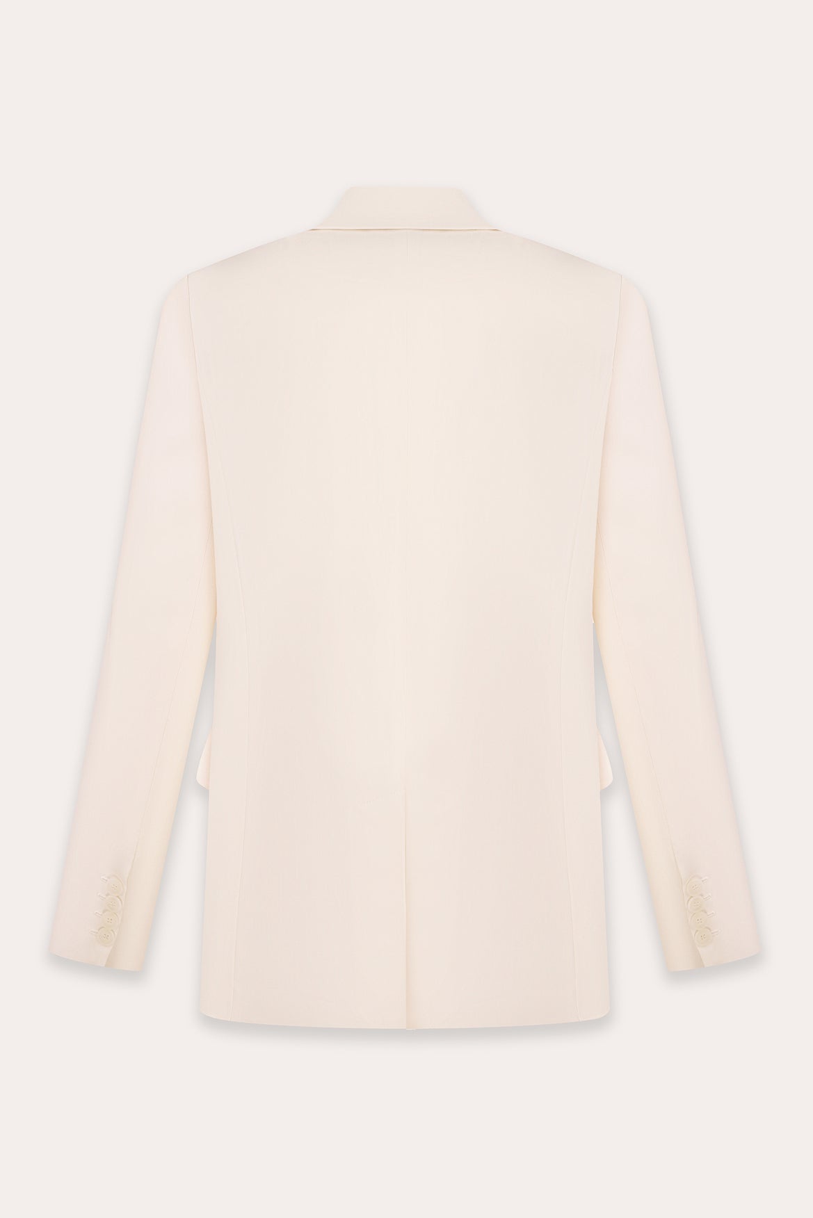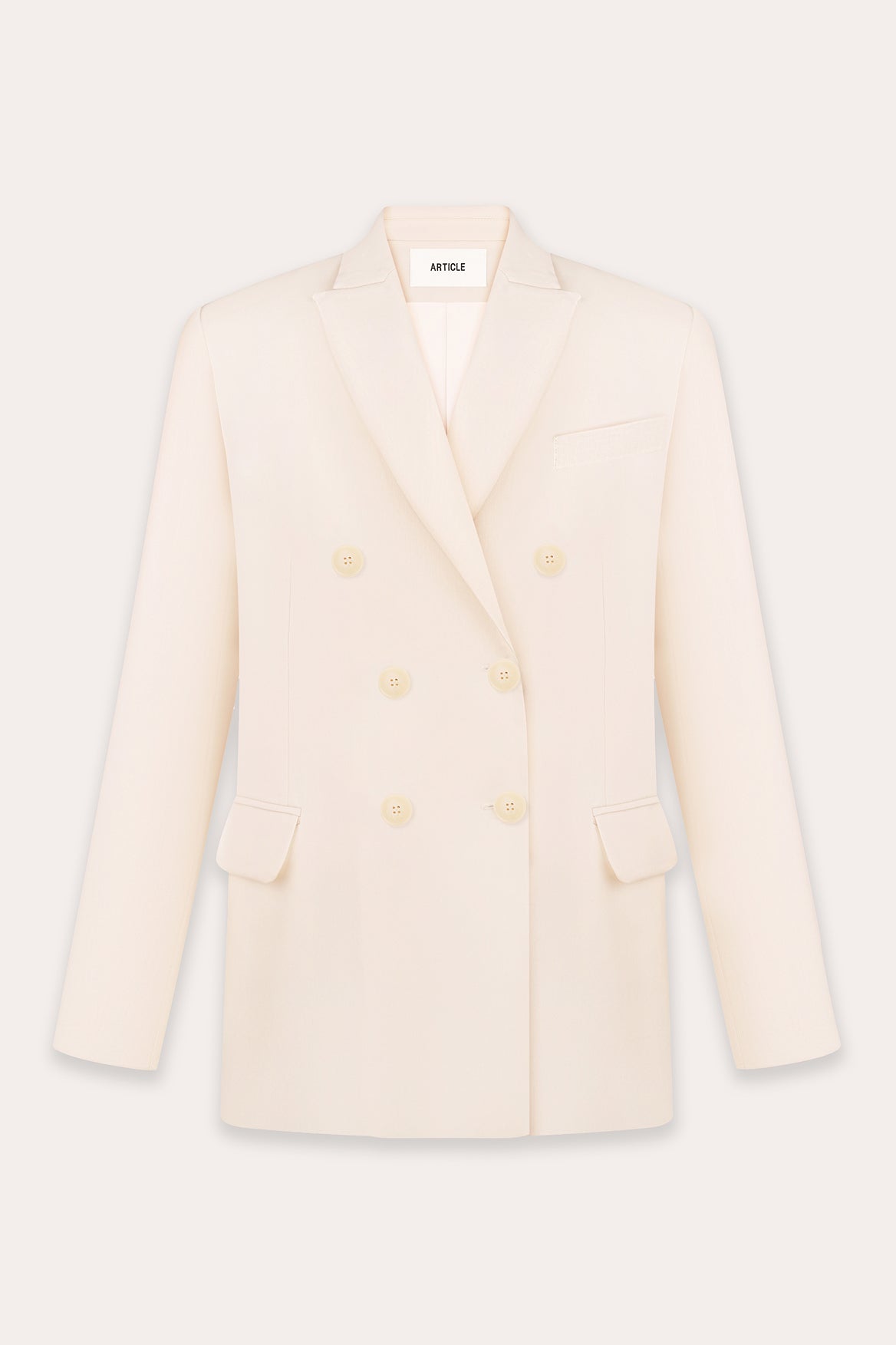 Двобортний класичний блейзер виконаний із вовни, його крій підкреслює жіночу фігуру, щільно прилягає до тіла і має завужену талію.