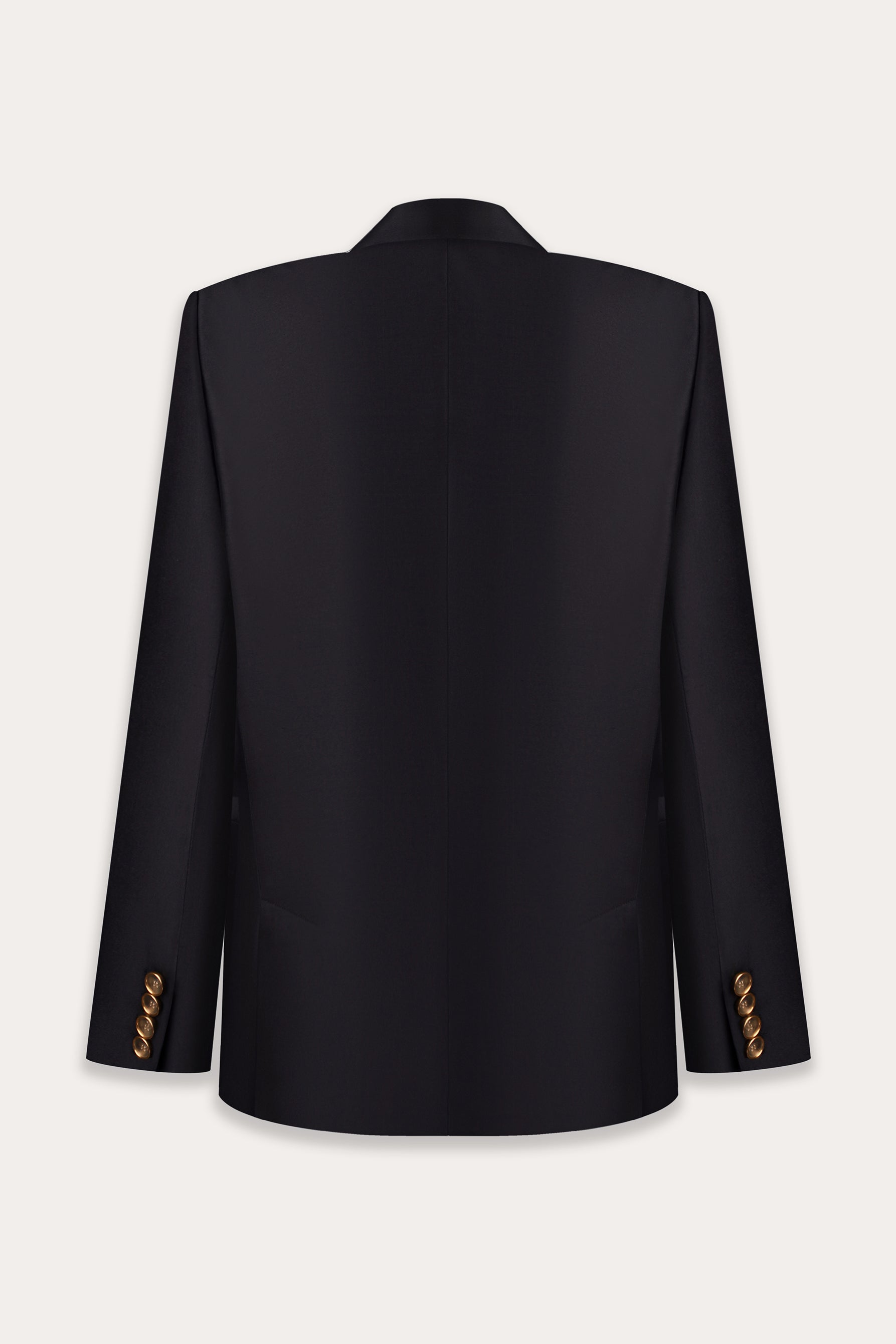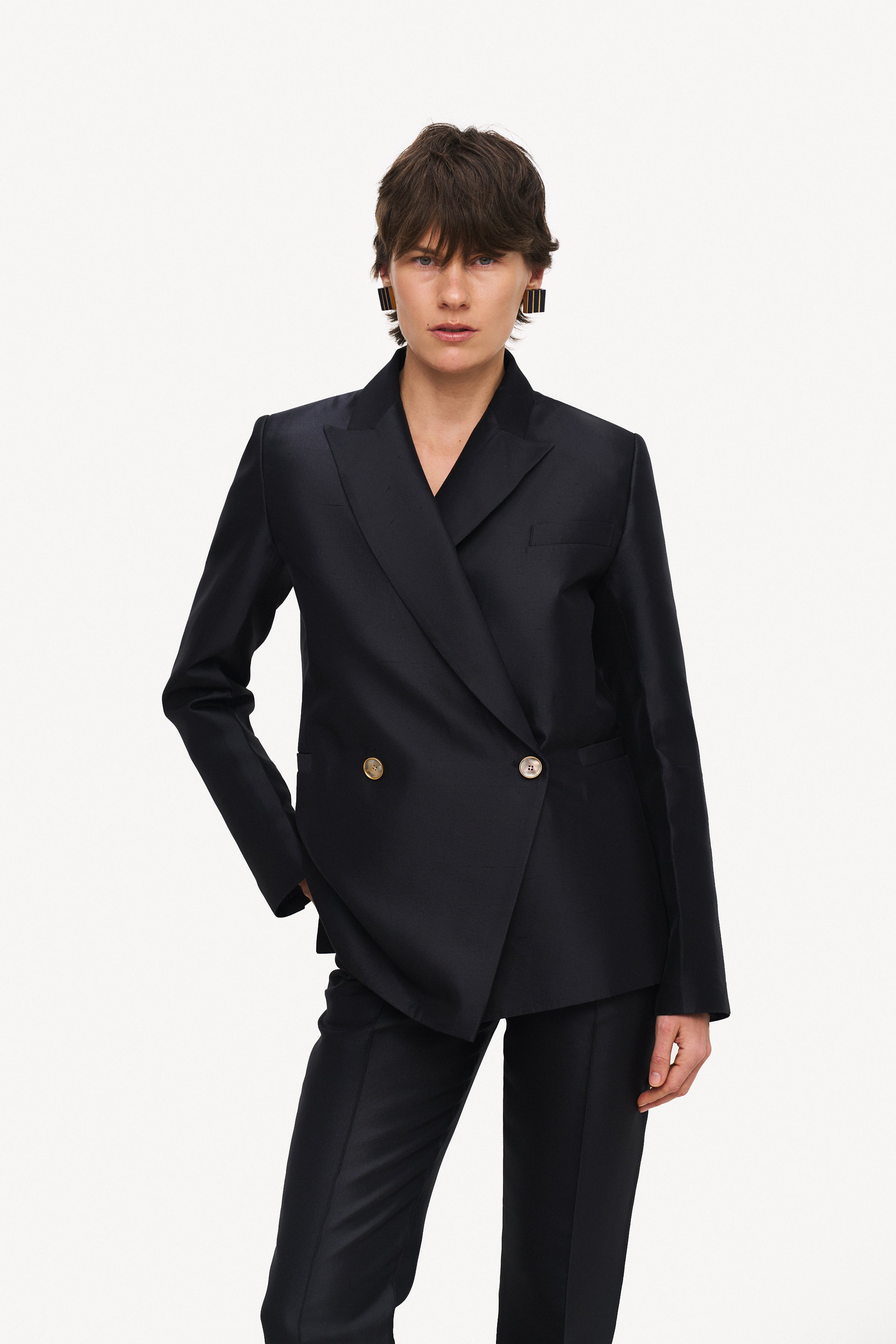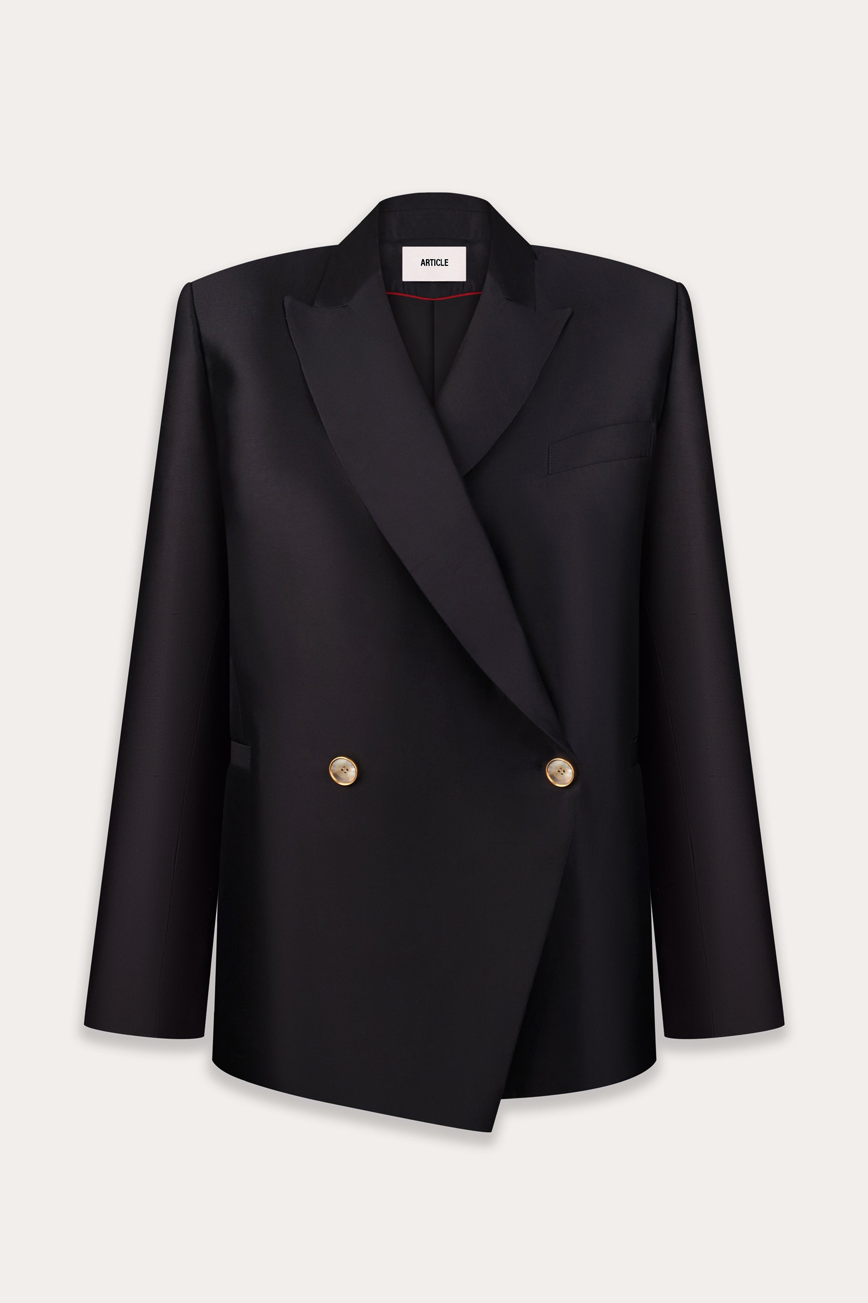 Асиметричний двобортний блейзер New York із натурального шовку. Модель має прорізні кишені і яскраво виражену форму лацканів. Дизайн прикрашають контрастні ґудзики із золотим відтінком.
