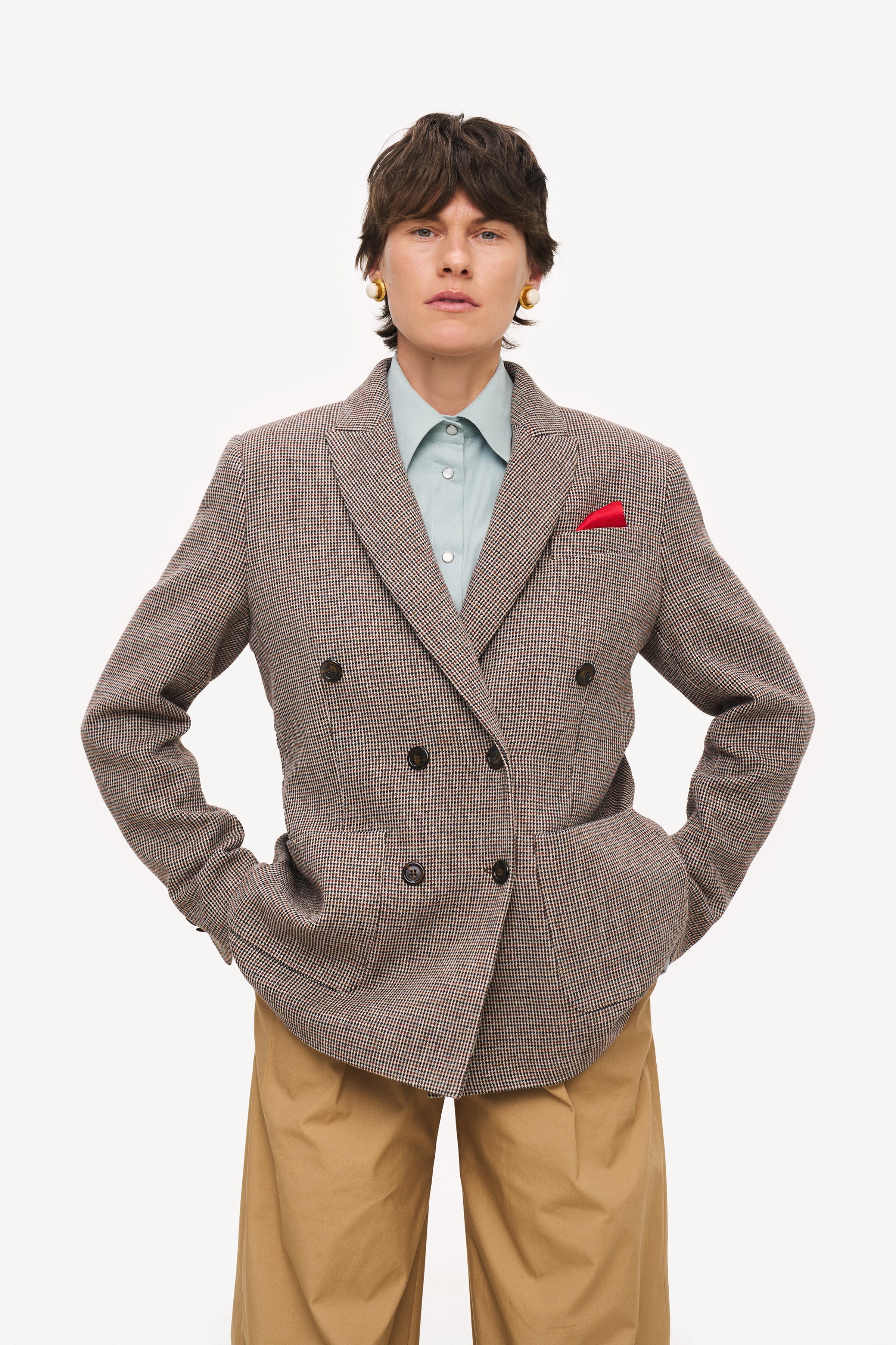 Двобортний блейзер Riviera виконаний з натуральної вовни. Модель має прямий крій вздовж лінії талії. Передня частина доповнена накладними кишенями, а спинка й рукави — прорізними шліцами.