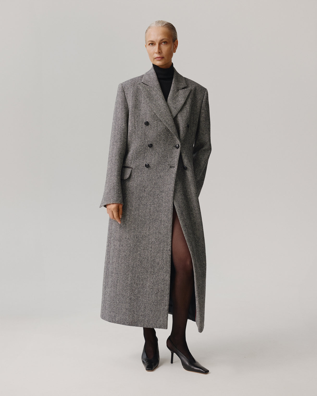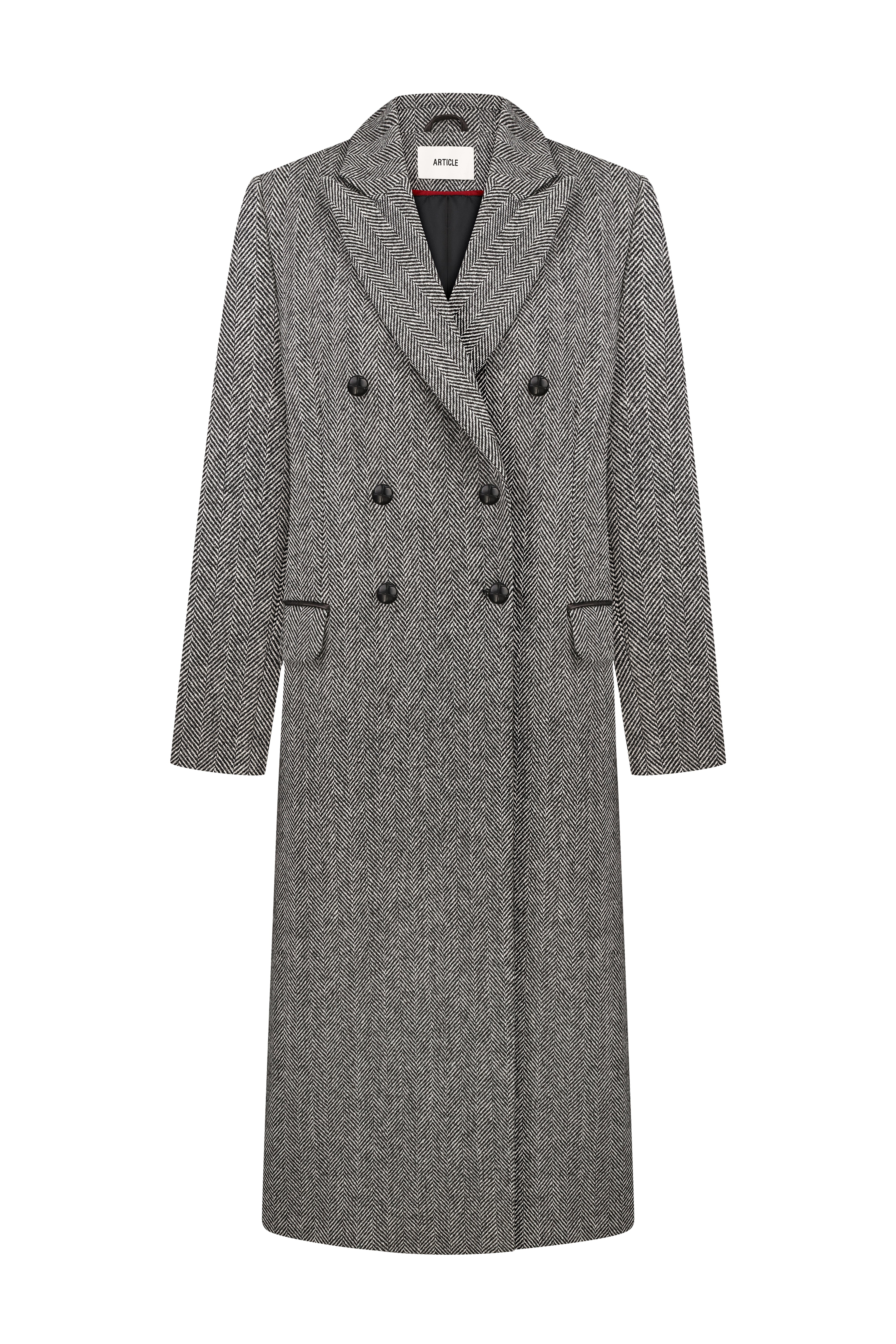 Класичне двобортне пальто, колір - сіра ялинка. Модель має