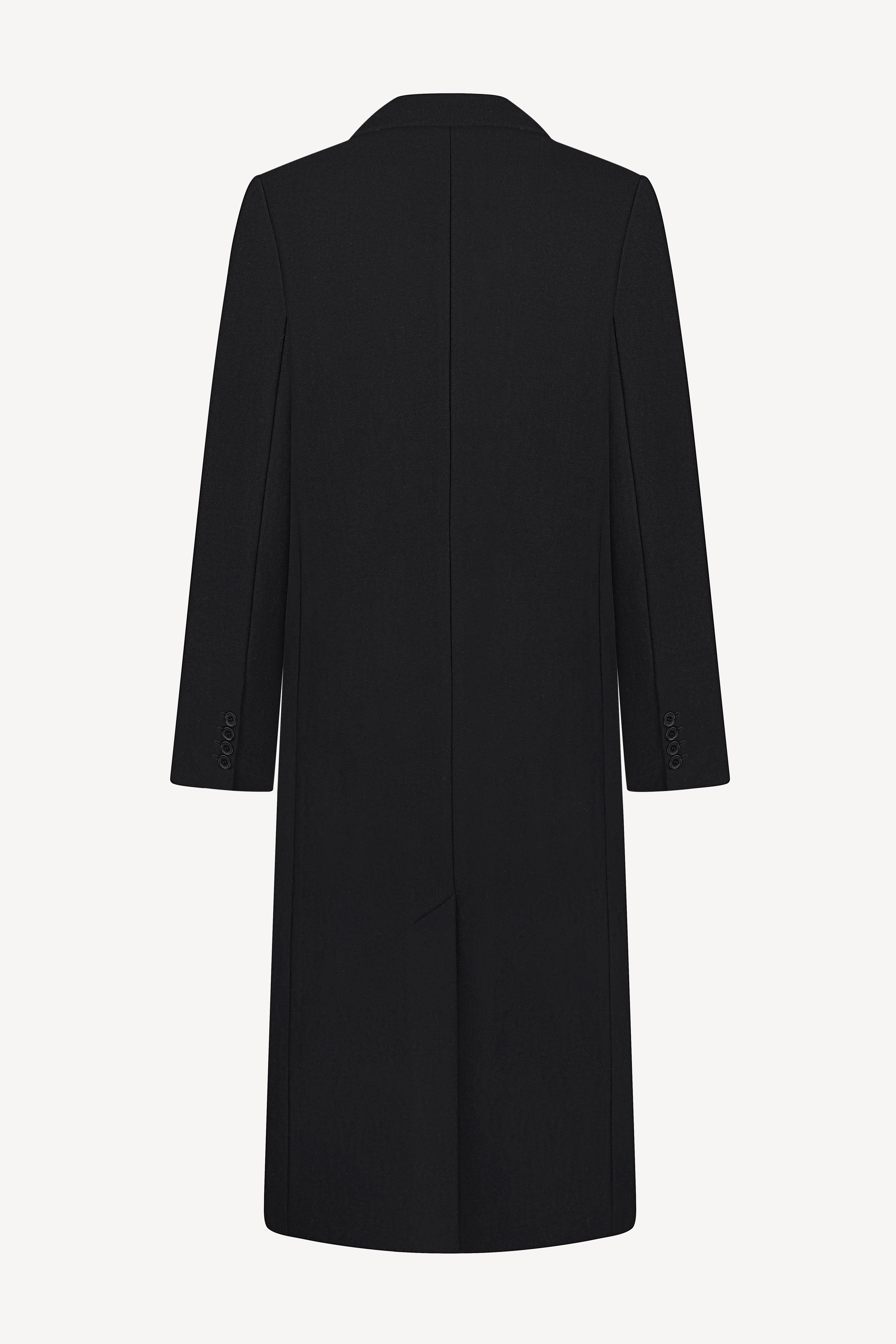 Однобортне чорне пальто прямого силуету, що виконане із