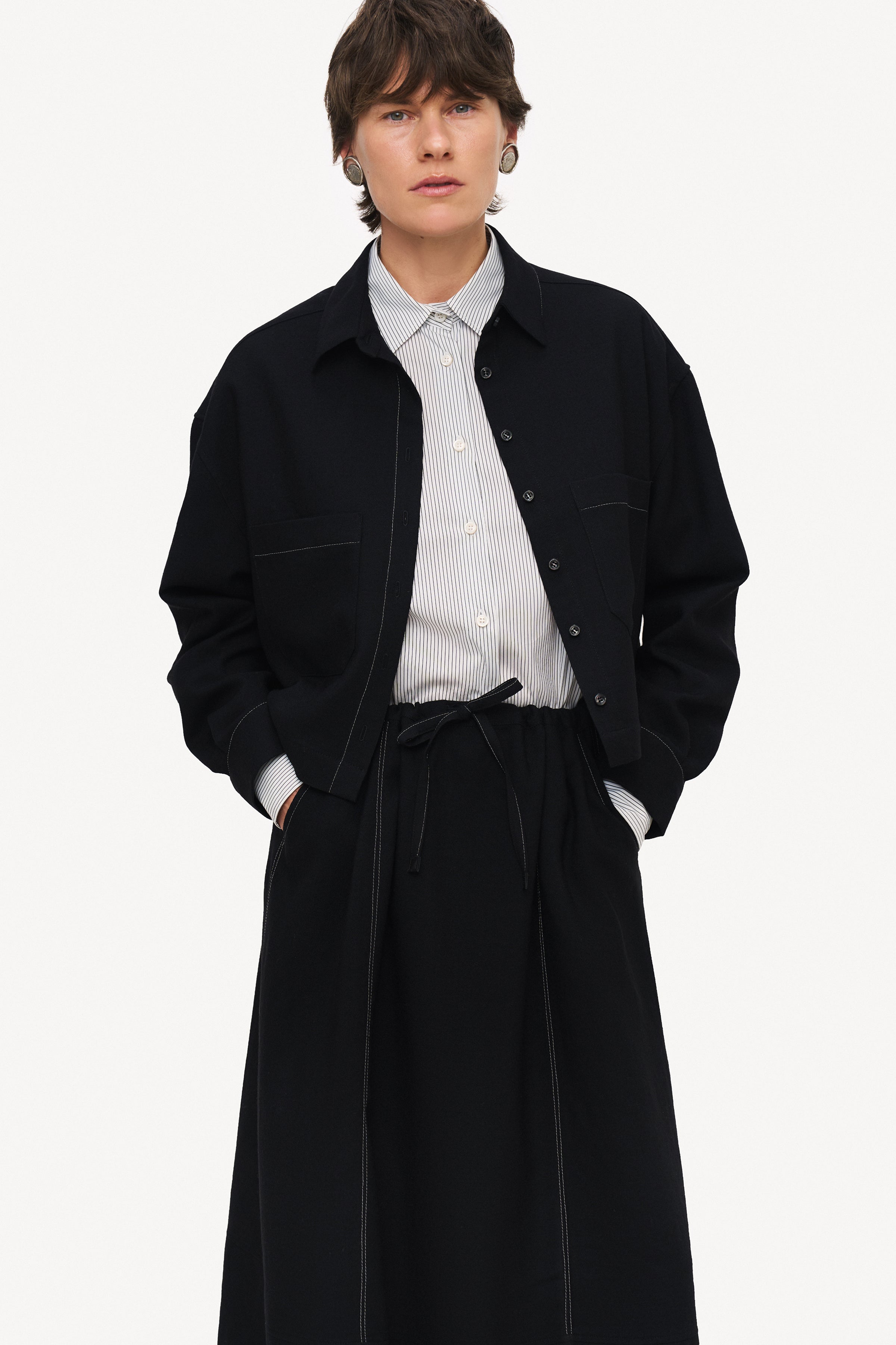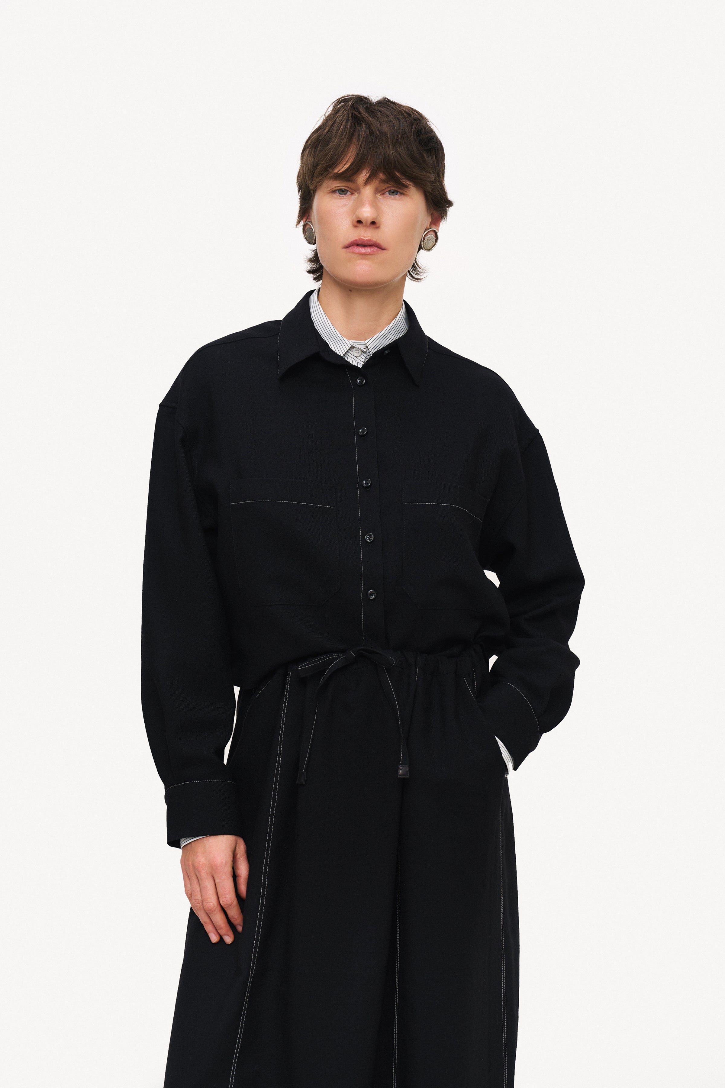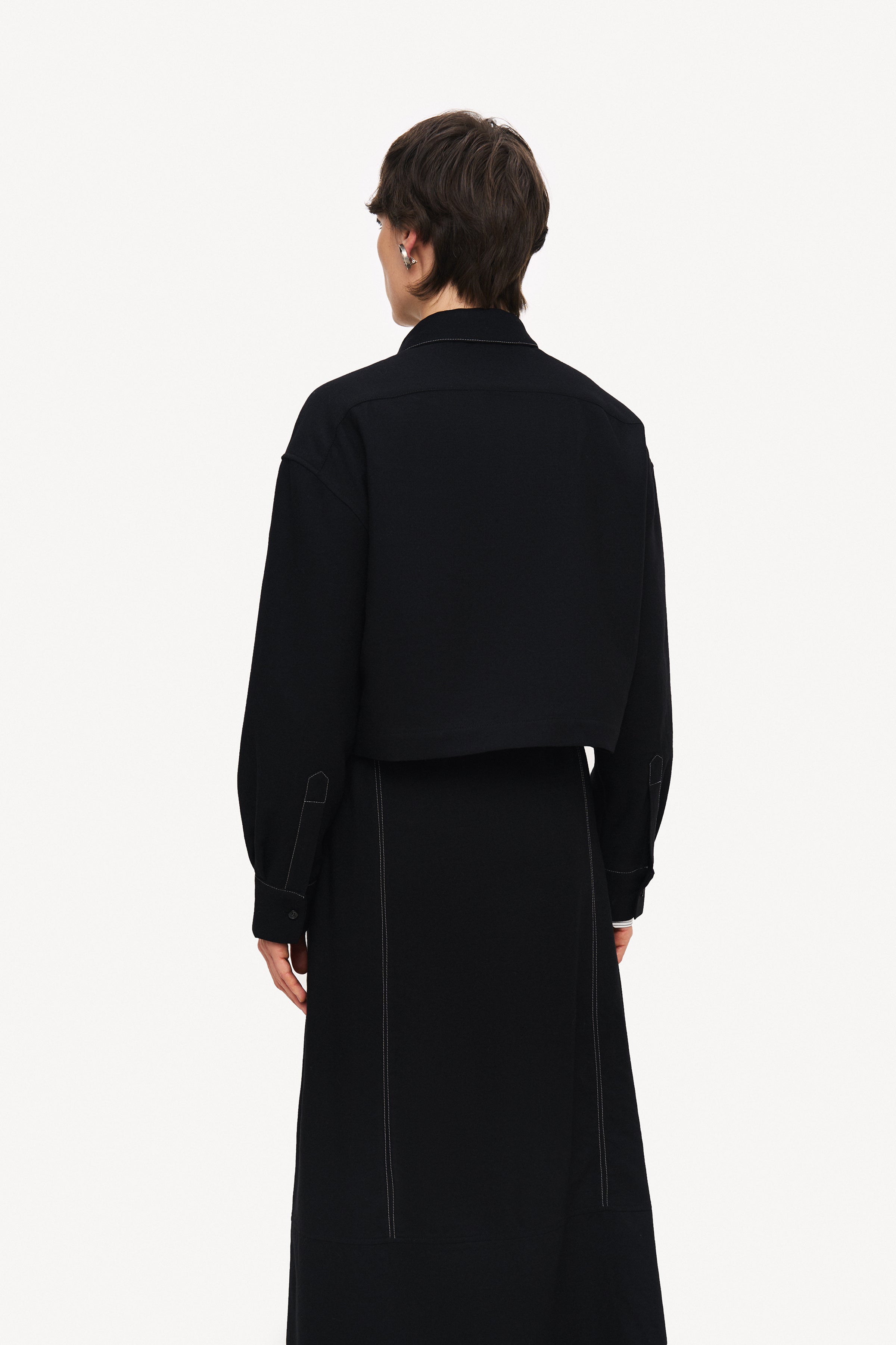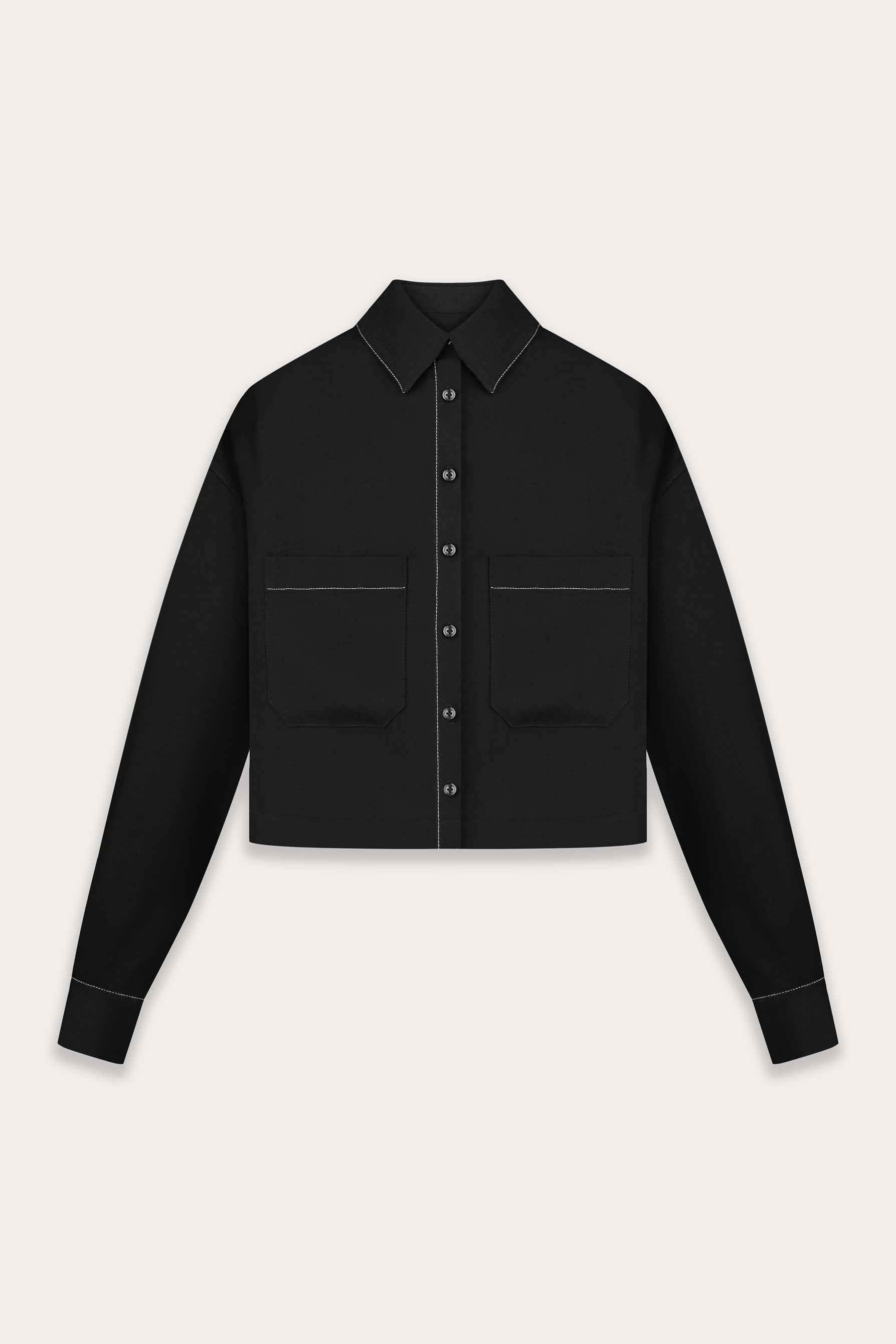Вкорочена сорочка оверсайз Cropped виготовлена із легкої вовни. Модель виконана у мінімалістичному стилі, виріб прикрашають контрасні білі стібки і фронтальні кишені.