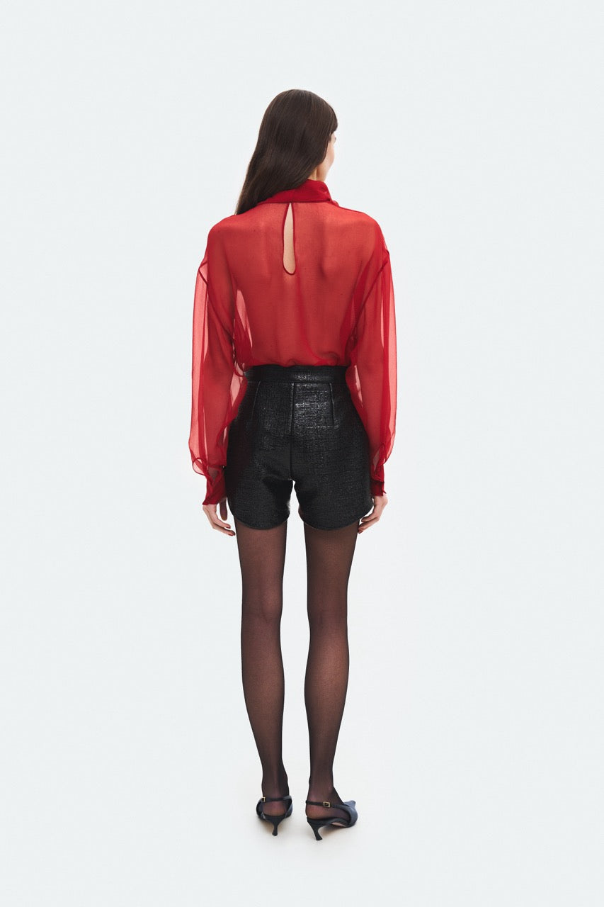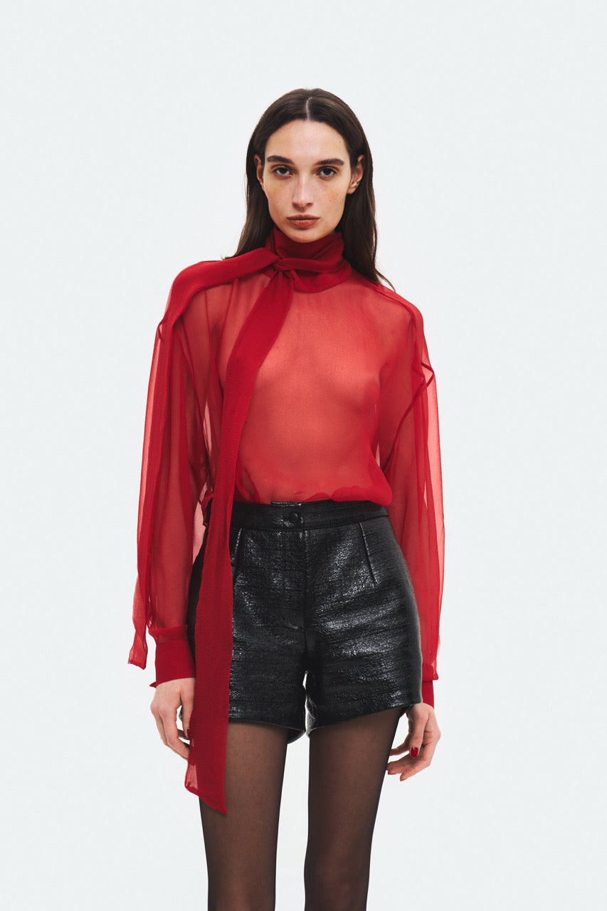 Прозора сорочка Magda виконана з натурального шовку. Модель доповнена подовженим шарфом-шаллю та зав’язкою-бантом на шиї.