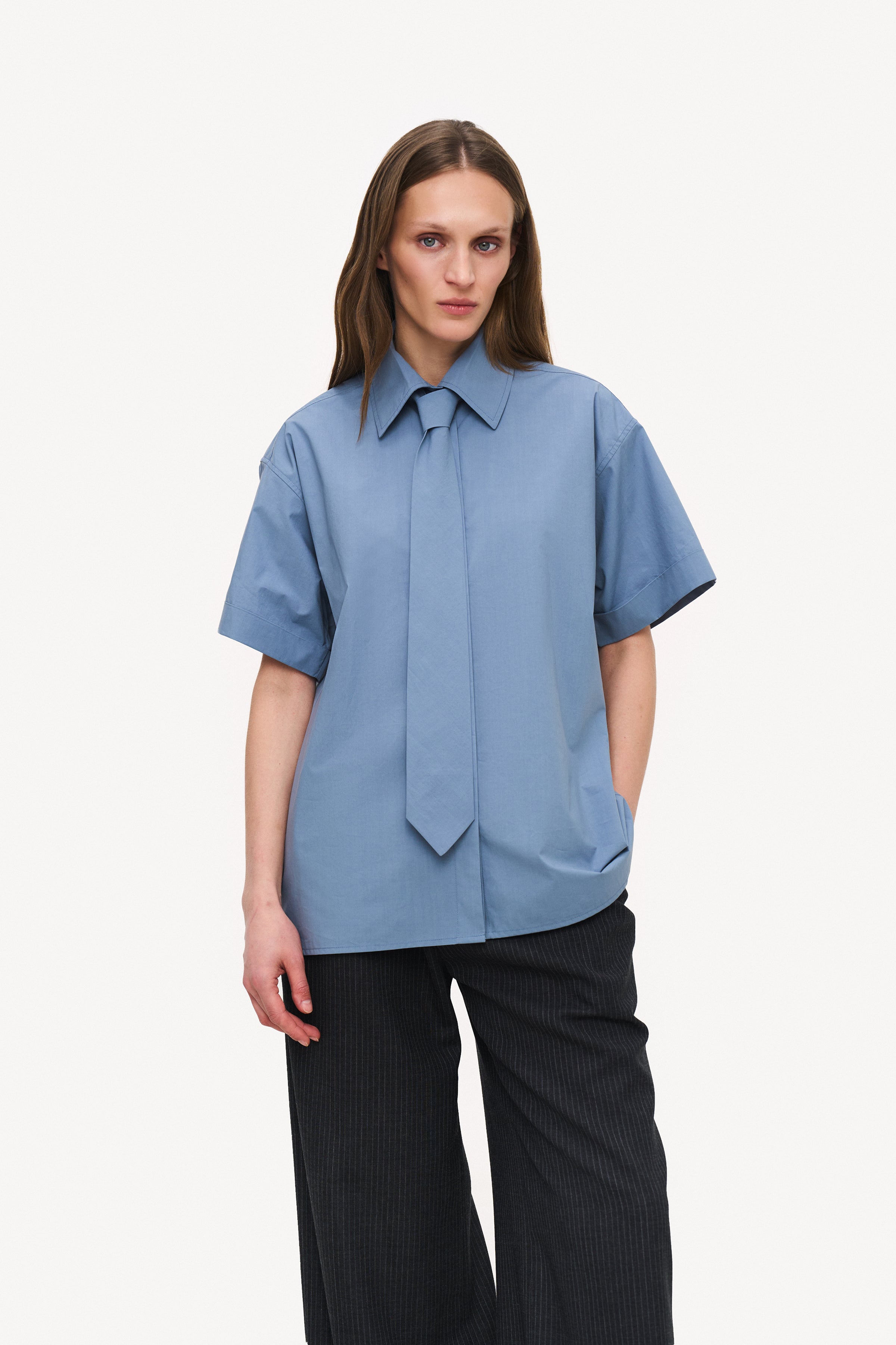 Кежуальна оверсайз сорочка Marry виготовлена з натуральної бавовни. Модель з коротким рукавом, доповнена краваткою в тон.