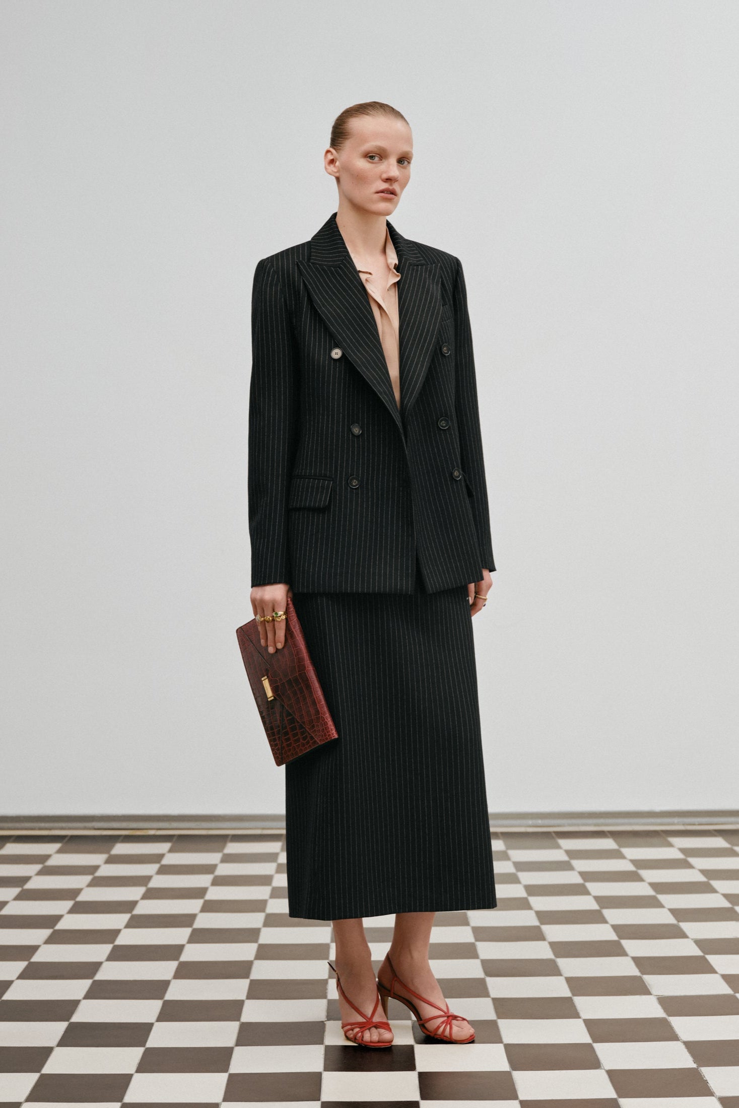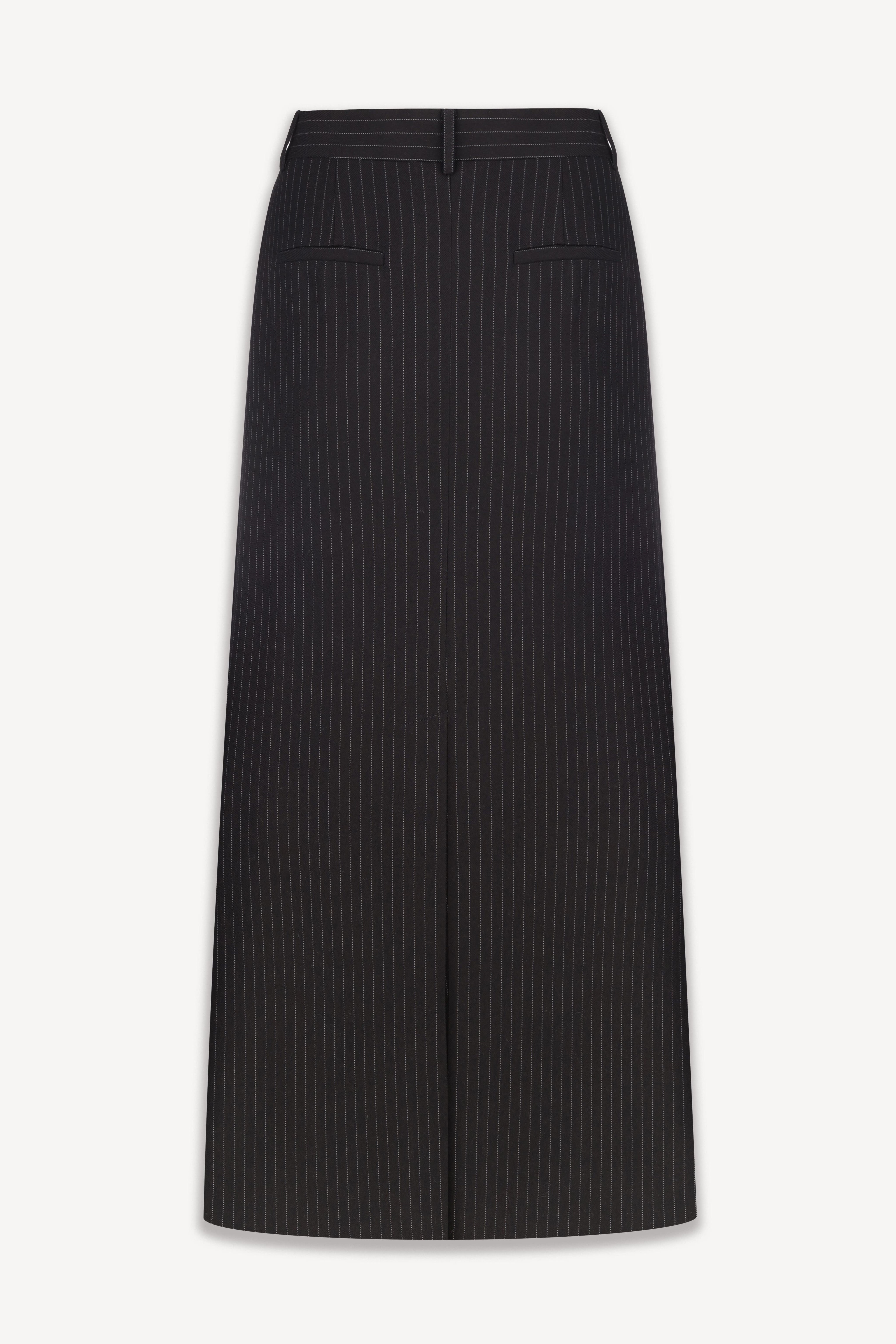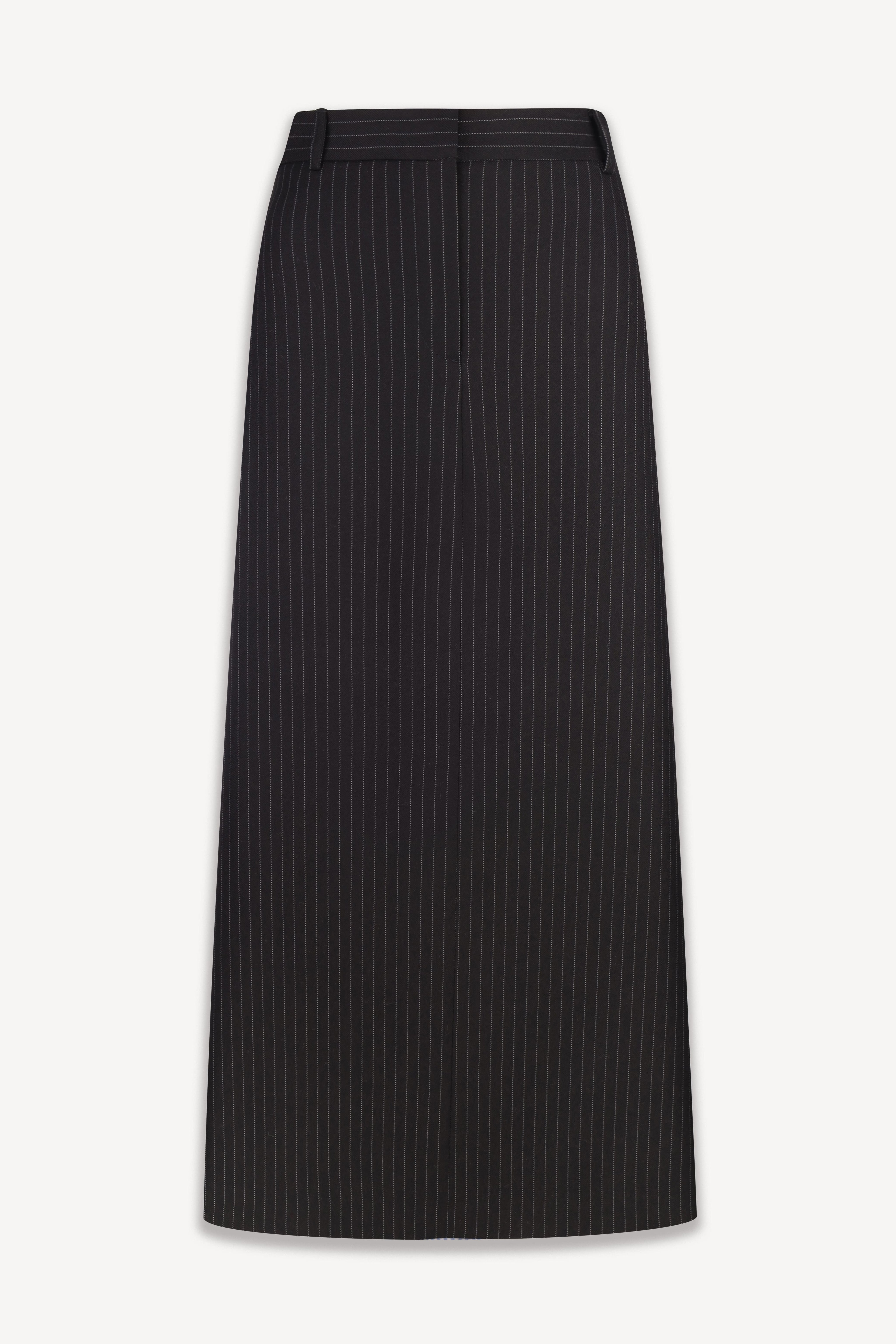Спідниця-олівець з високою посадкою. Модель виконана з натуральної мʼякої вовни з вертикальним візерунком. На задній частині виробу розташовані дві прорізні кишені.