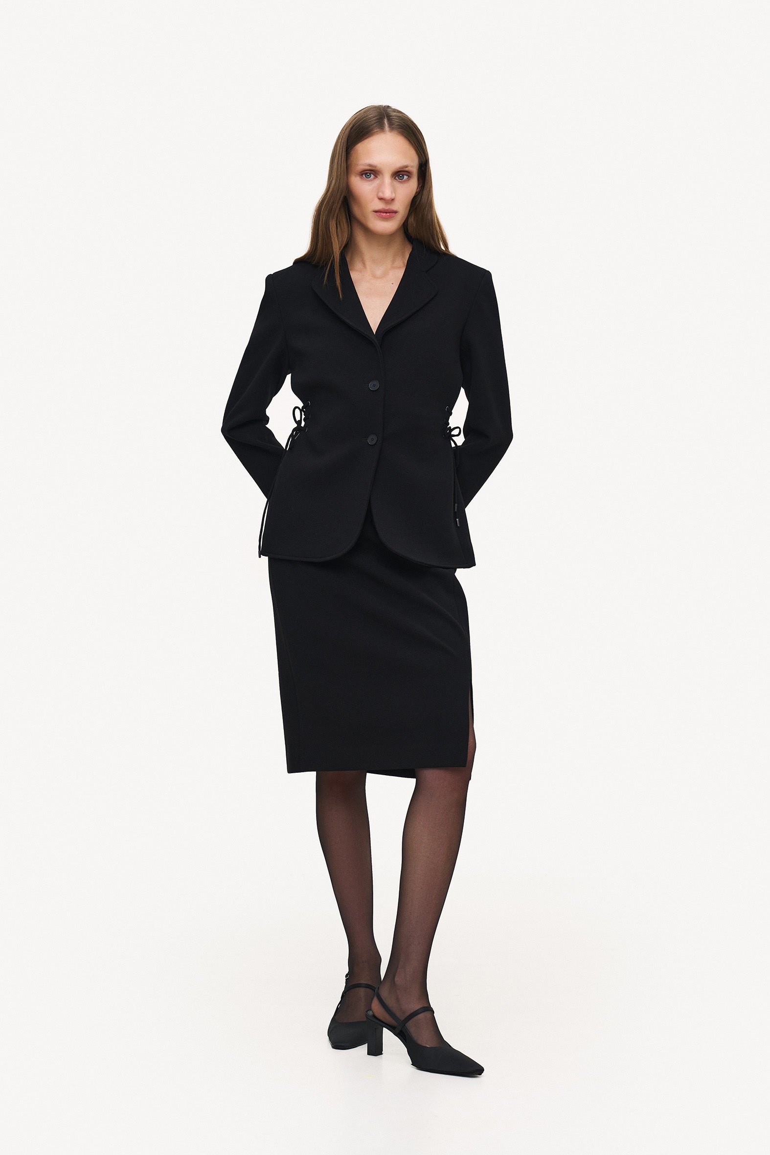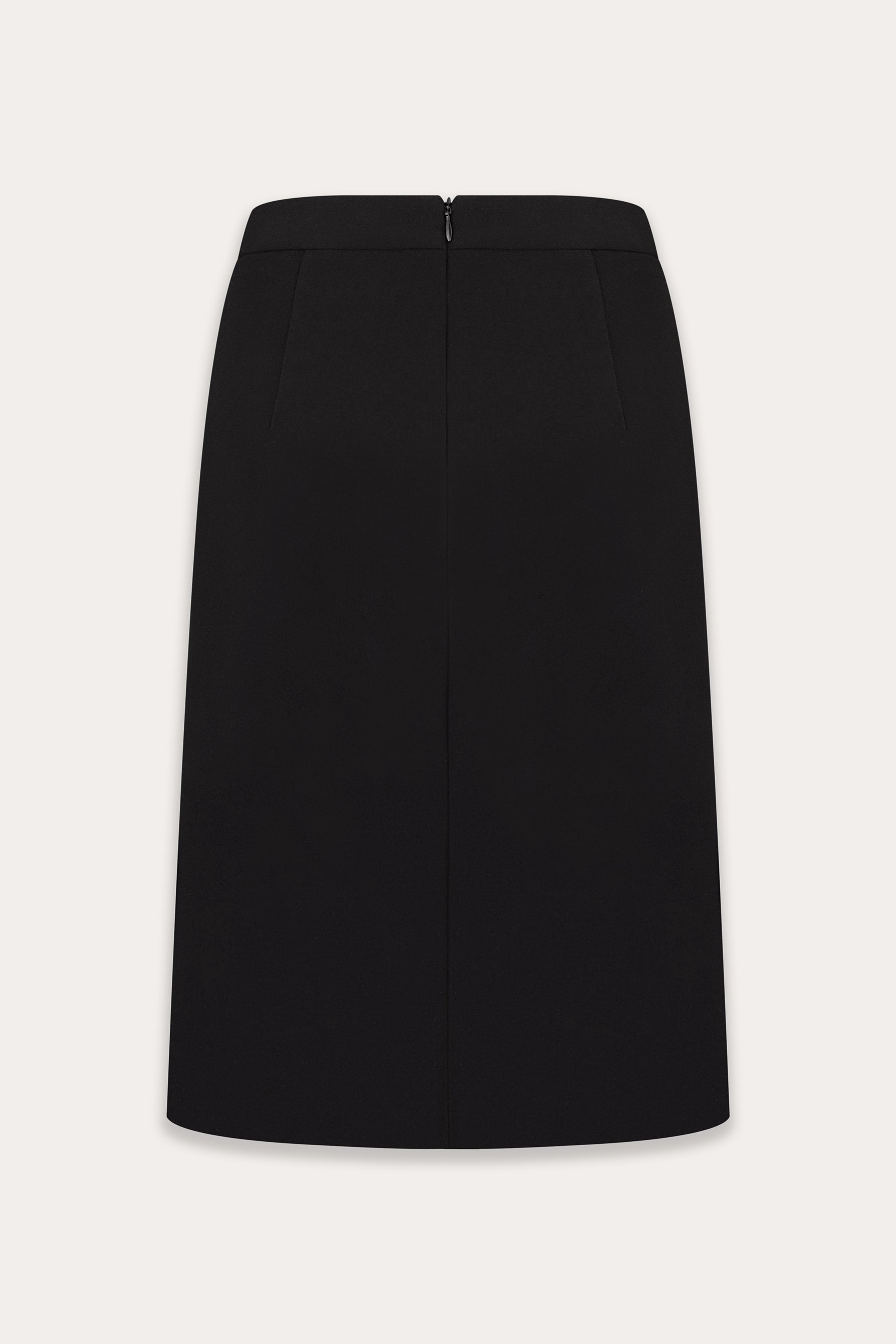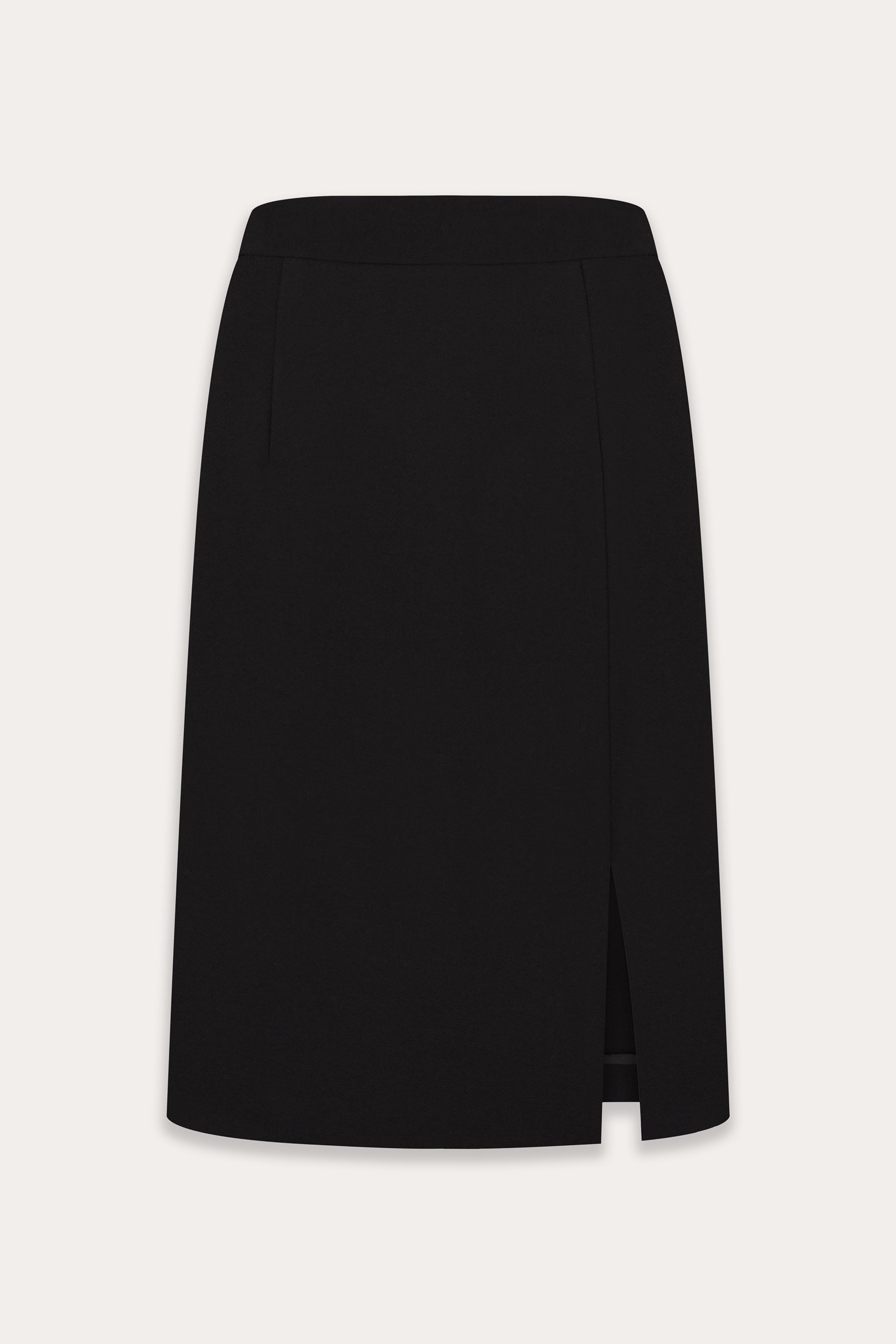 Класична спідниця-олівець Octavia із завищеною талією, виготовлена з натуральної мʼякої вовни та шовку. Модель має високий бічний розріз.